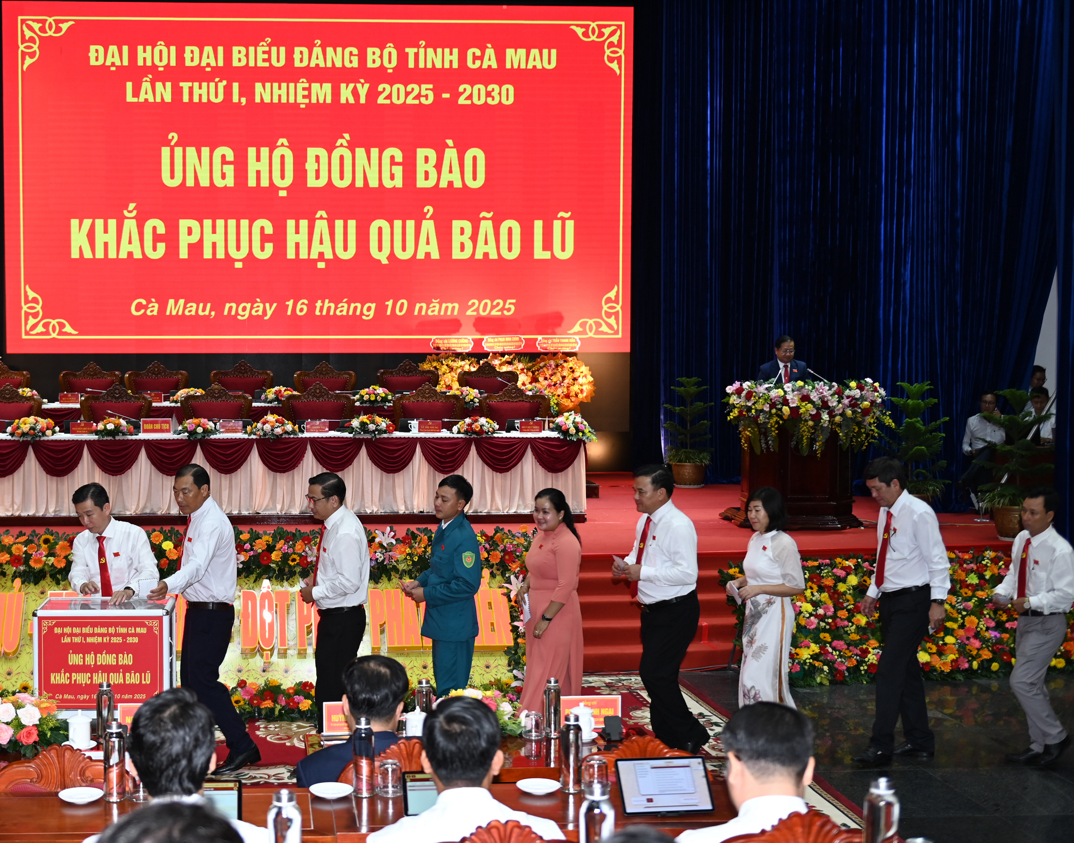Các đại biểu dự Đại hội đại biểu Đảng bộ tỉnh Cà Mau lần thứ I, nhiệm kỳ 2025 – 2030, ủng hộ đồng bào khắc phục hậu quả bão lũ. ẢNH: BTC