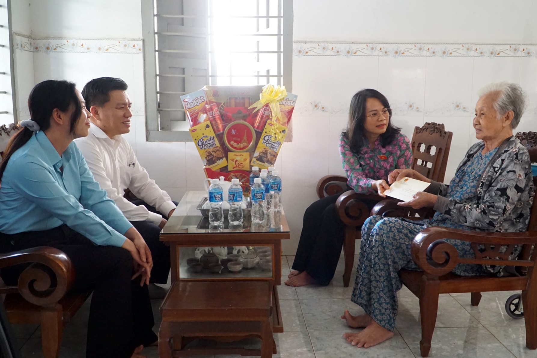 Đồng chí Phạm Thị Hồng Yến và lãnh đạo phường Bình Thuận thăm tặng quà Tết cho bệnh binh Nguyễn Thị Thà