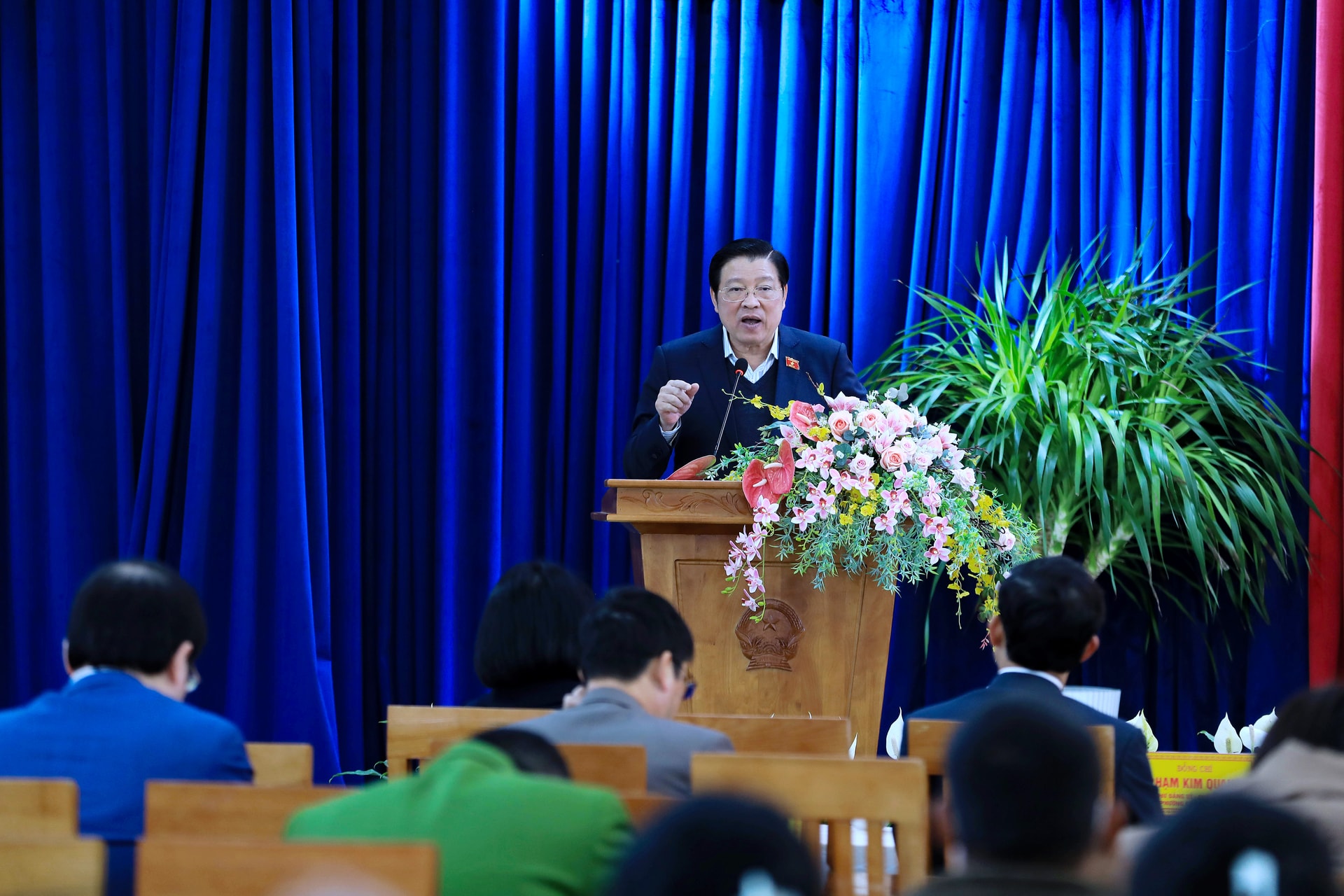Đồng chí Phan Đình Trạc nhấn mạnh các vấn đề phát sinh từ thực tiễn tại buổi tiếp xúc cử tri tại phường Cam Ly - Đà Lạt