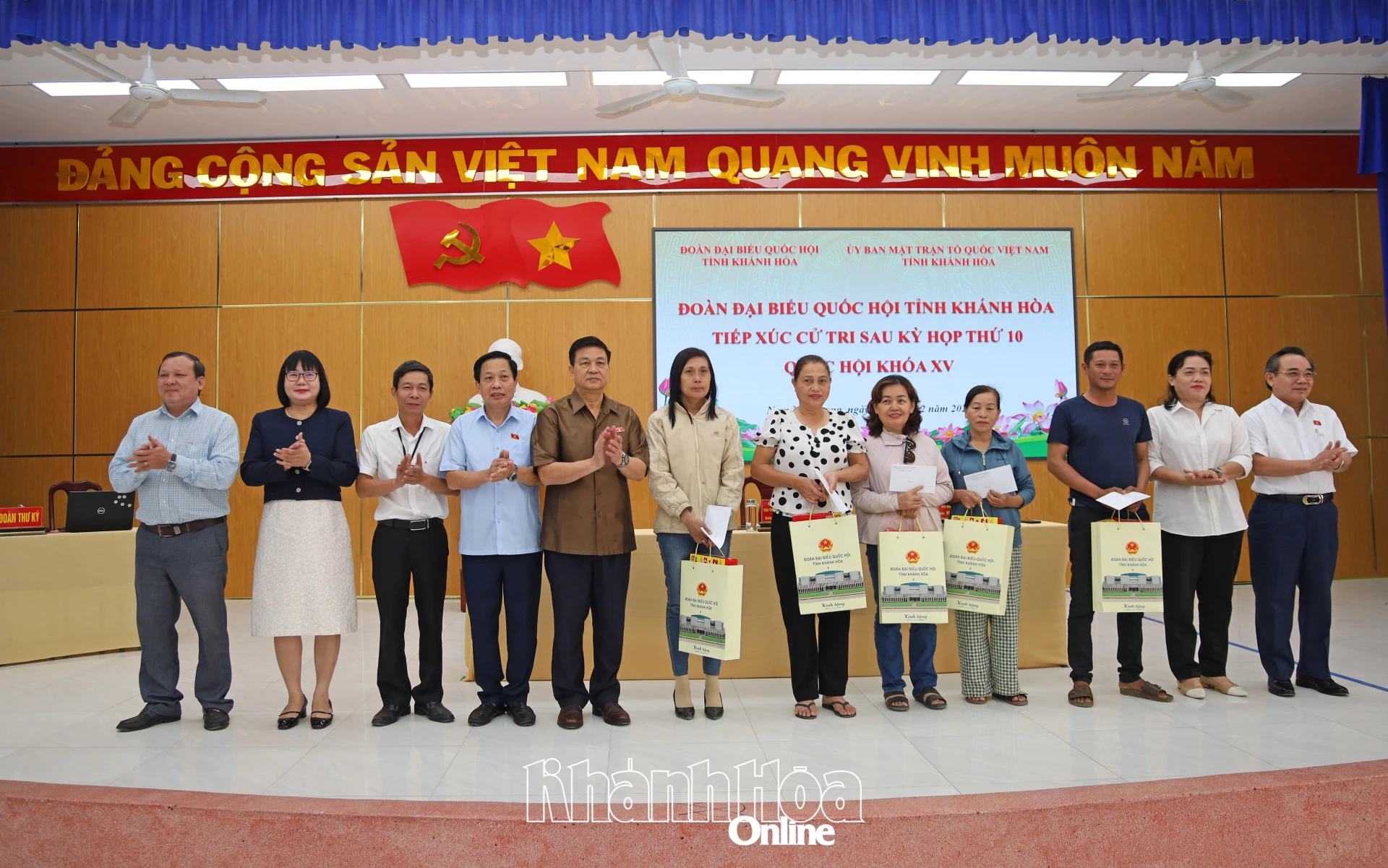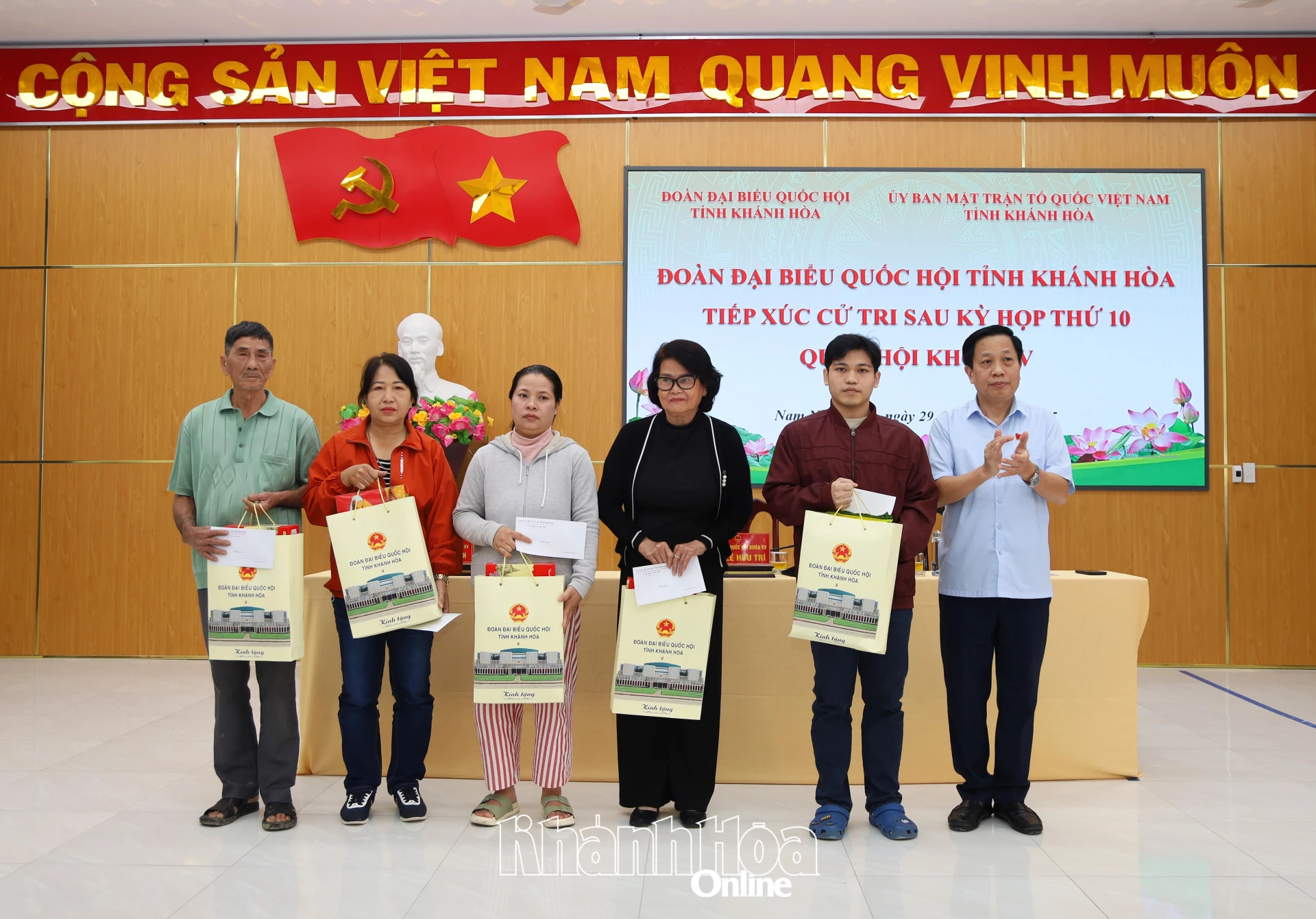 Trong chương trình tiếp xúc cử tri, các đại biểu Quốc hội tỉnh đã trao 15 phần quà hỗ trợ các hộ dân thuộc phường Nam Nha Trang bị ảnh hưởng trong đợt mưa lũ vừa qua.