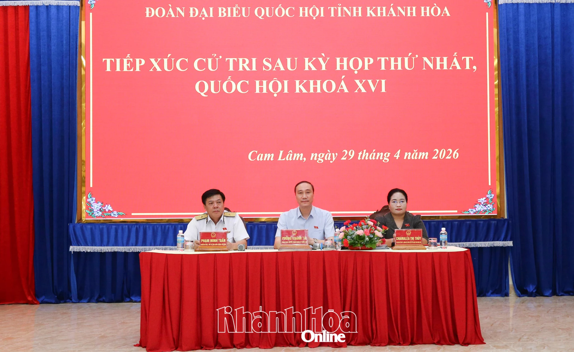Chiều 29-4, đại biểu Quốc hội tỉnh Khánh Hòa gồm các đồng chí: Phùng Khánh Tài - Phó Bí thư chuyên trách Đảng ủy Quốc hội; Chuẩn Đô đốc Phạm Minh Tuấn - Phó Tư lệnh Quân chủng Hải quân; Chamaleá Thị Thủy - Ủy viên Ban Thường vụ Tỉnh ủy, Giám đốc Sở Dân tộc và Tôn giáo tiếp xúc cử tri xã Cam Lâm sau Kỳ họp thứ nhất, Quốc hội khóa XVI.