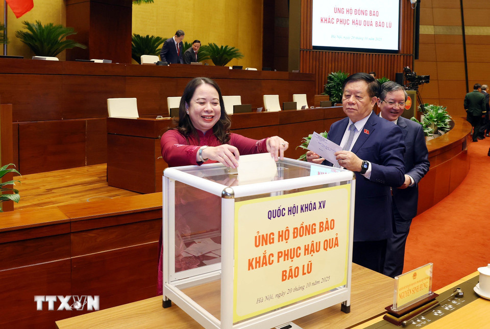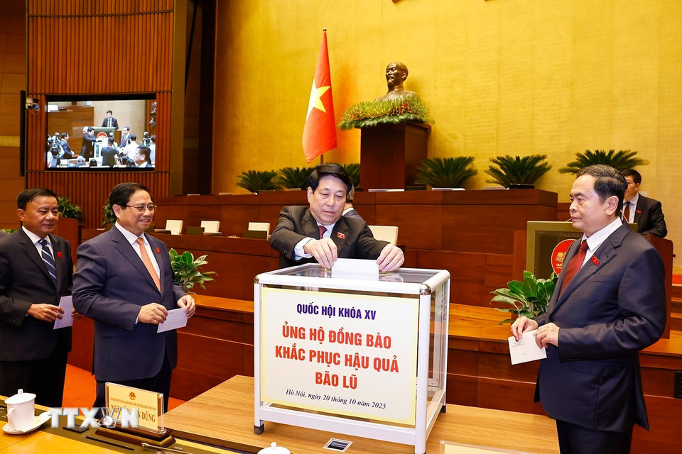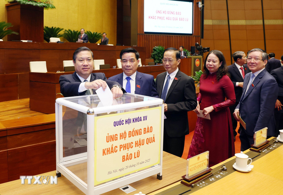 Tổng Bí thư Tô Lâm, Chủ tịch nước Lương Cường, Thủ tướng Phạm Minh Chính, Chủ tịch Quốc hội Trần Thanh Mẫn và đại biểu Quốc hội ủng hộ đồng bào khắc phục hậu quả bão lũ. (Ảnh: Doãn Tấn/TTXVN)