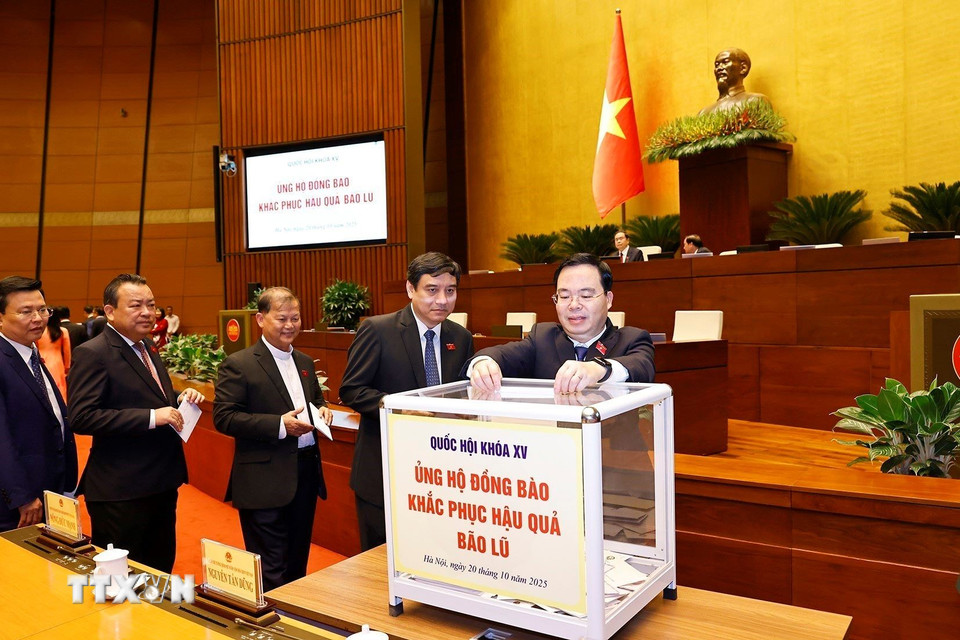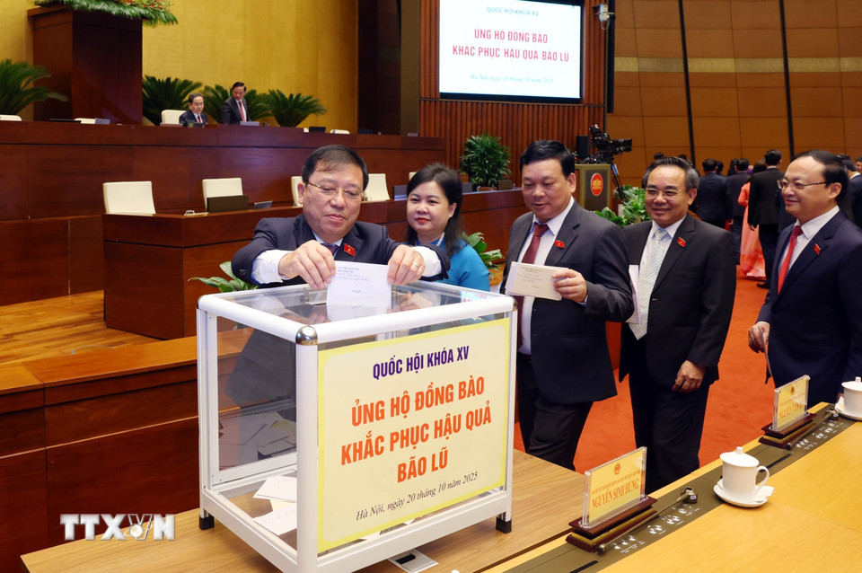 Các đại biểu Quốc hội ủng hộ đồng bào khắc phục hậu quả do cơn bão số 11 gây ra. (Ảnh: Doãn Tấn/TTXVN)