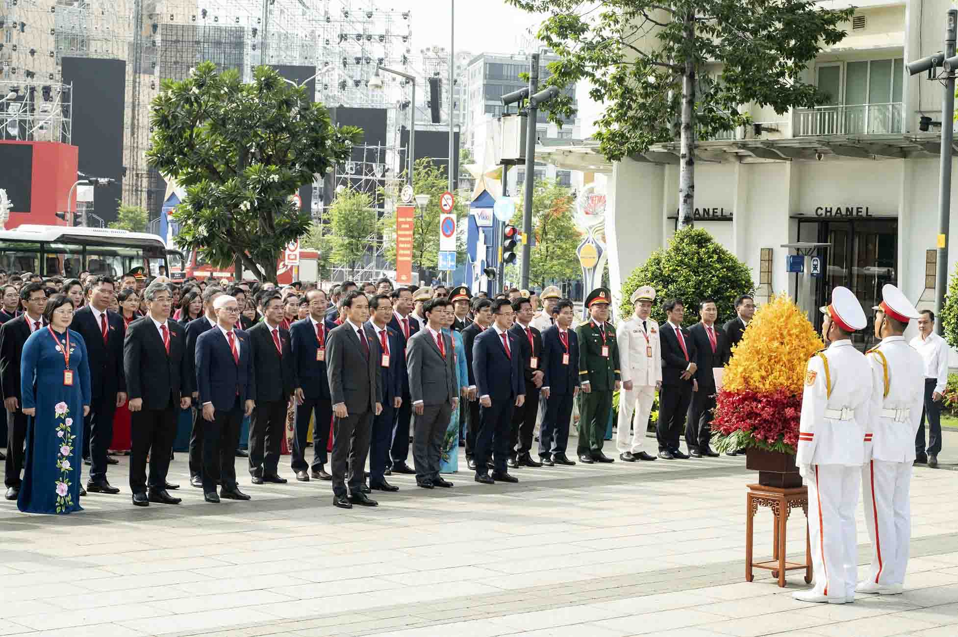 Đoàn đại biểu đặt vòng hoa tại Tượng đài Chủ tịch Hồ Chí Minh trên Phố đi bộ Nguyễn Huệ, thành kính tri ân, tưởng nhớ công lao to lớn của Chủ tịch Hồ Chí Minh. Ảnh: BTC.