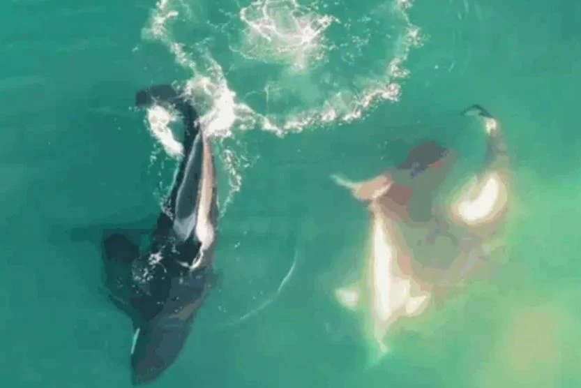 Đoạn clip được ghi lại tại vùng biển thuộc vịnh Mossel, Nam Phi đã khiến cộng đồng yêu thích sinh vật biển chấn động. Cảnh tượng cho thấy ba con cá voi sát thủ phối hợp nhịp nhàng để hạ gục một con cá mập trắng dài 2,7 mét, loài vốn được xem là đỉnh cao chuỗi thức ăn dưới biển.