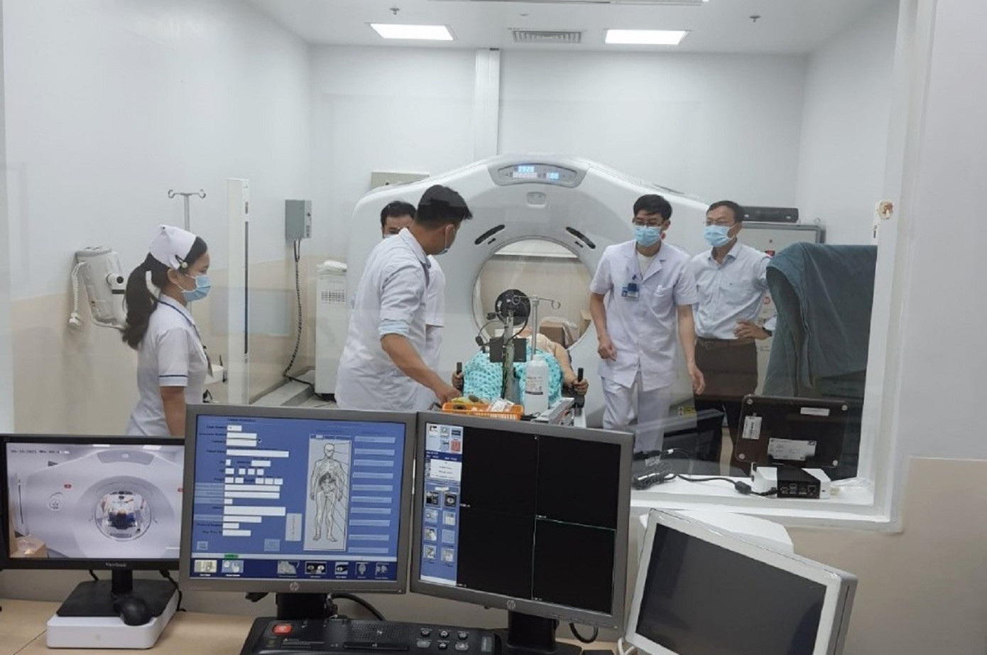 Các bác sĩ Bệnh viện Ung Bướu TPHCM chuẩn bị cho người bệnh bước vào quá trình xạ trị. Ảnh: BVCC