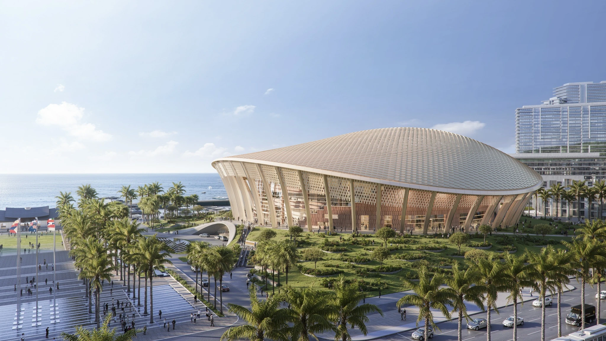 Trong ảnh là hạng mục Trung tâm Hội nghị và Triển lãm với tổng diện tích sàn 157.375 m2, gồm 4 tầng nổi và 1 tầng hầm, đáp ứng đa dạng chức năng như tổ chức hội nghị, phòng tiệc, khu triển lãm, không gian dinner show và hệ thống nhà hàng, phục vụ các sự kiện đối nội và đối ngoại quy mô lớn.