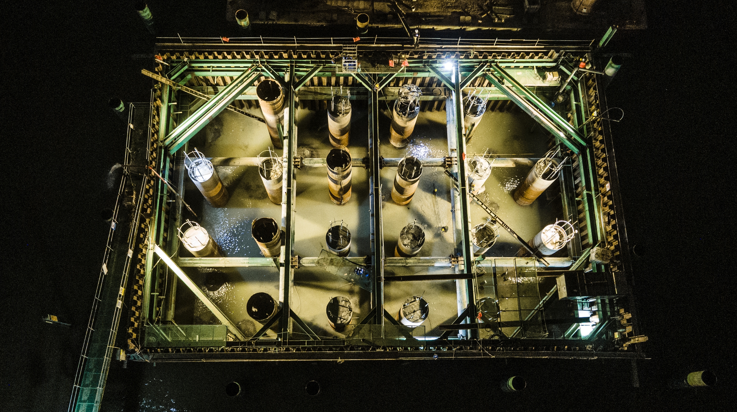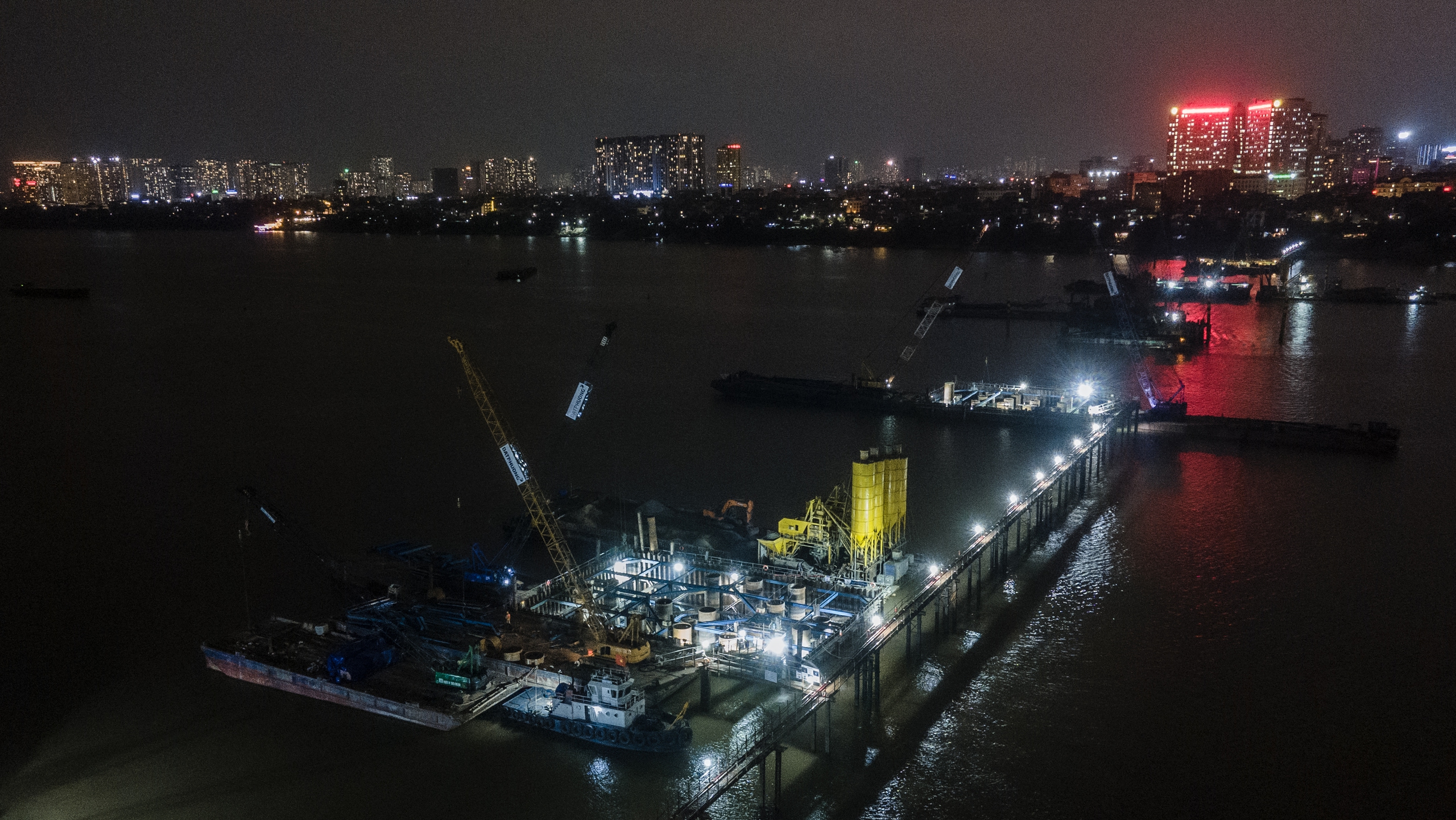 21h tối, nhìn từ trên cao, công trường cầu Trần Hưng Đạo vẫn rực sáng ánh đèn.