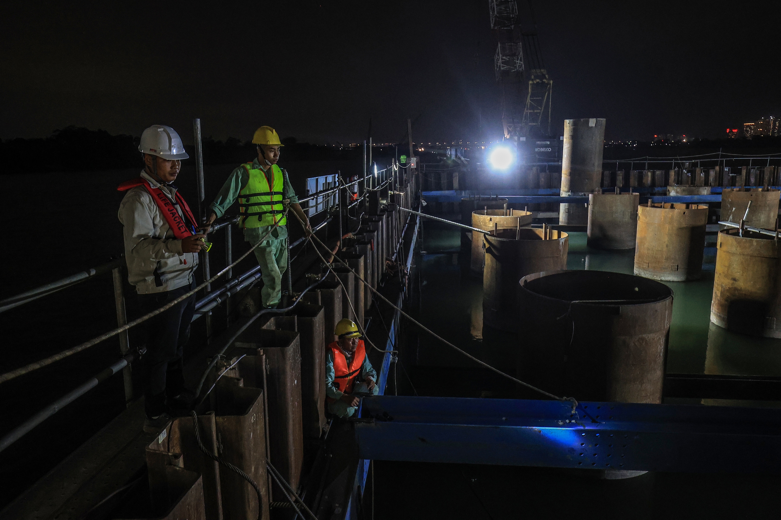 Không có khái niệm "ngày nghỉ", để kịp tiến độ, mỗi trụ cầu không còn một mũi khoan, mà là hai. Nhân lực tăng gấp đôi với hơn 200 kỹ sư, công nhân miệt mài thi công suốt 24/7.