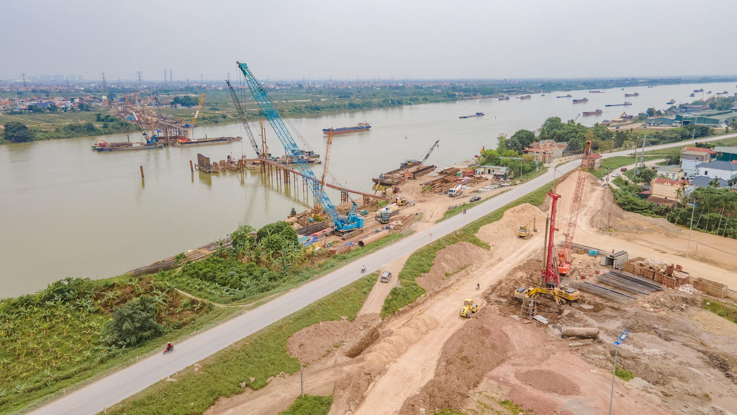 Xuôi về phía hạ lưu sông Hồng, công trường cầu Tứ Liên cũng đang bước vào giai đoạn tăng tốc, với các mũi thi công được triển khai đồng loạt.