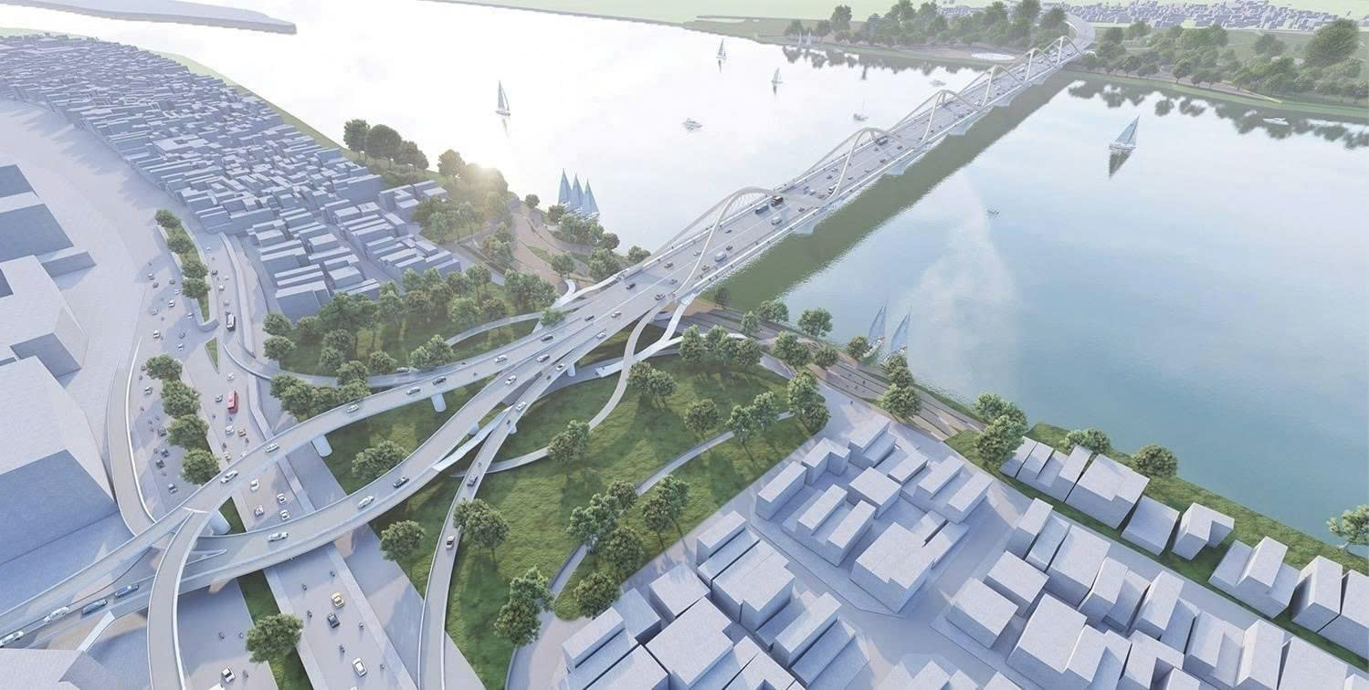 Nếu các địa phương bàn giao mặt bằng đúng cam kết, toàn bộ dự án được kỳ vọng sẽ hoàn thành vào quý II/2027 (trong ảnh: phối cảnh cầu Trần Hưng Đạo).