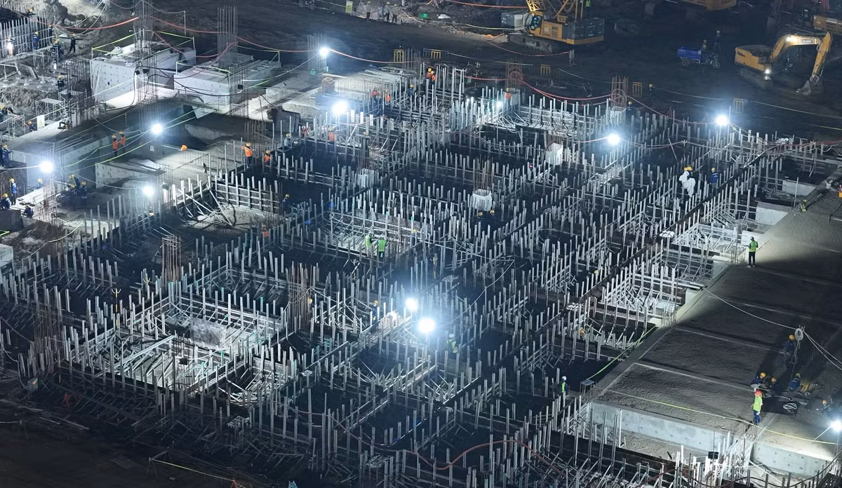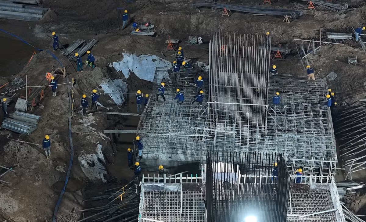 Những đêm cuối tháng 4, khu vực công trường Sân vận động Hùng Vương rực sáng ánh đèn. Hàng nghìn công nhân, máy móc hoạt động liên tục, xe tải ra vào không ngừng nghỉ, tạo nên nhịp thi công khẩn trương hiếm thấy tại một dự án thể thao ở Việt Nam.