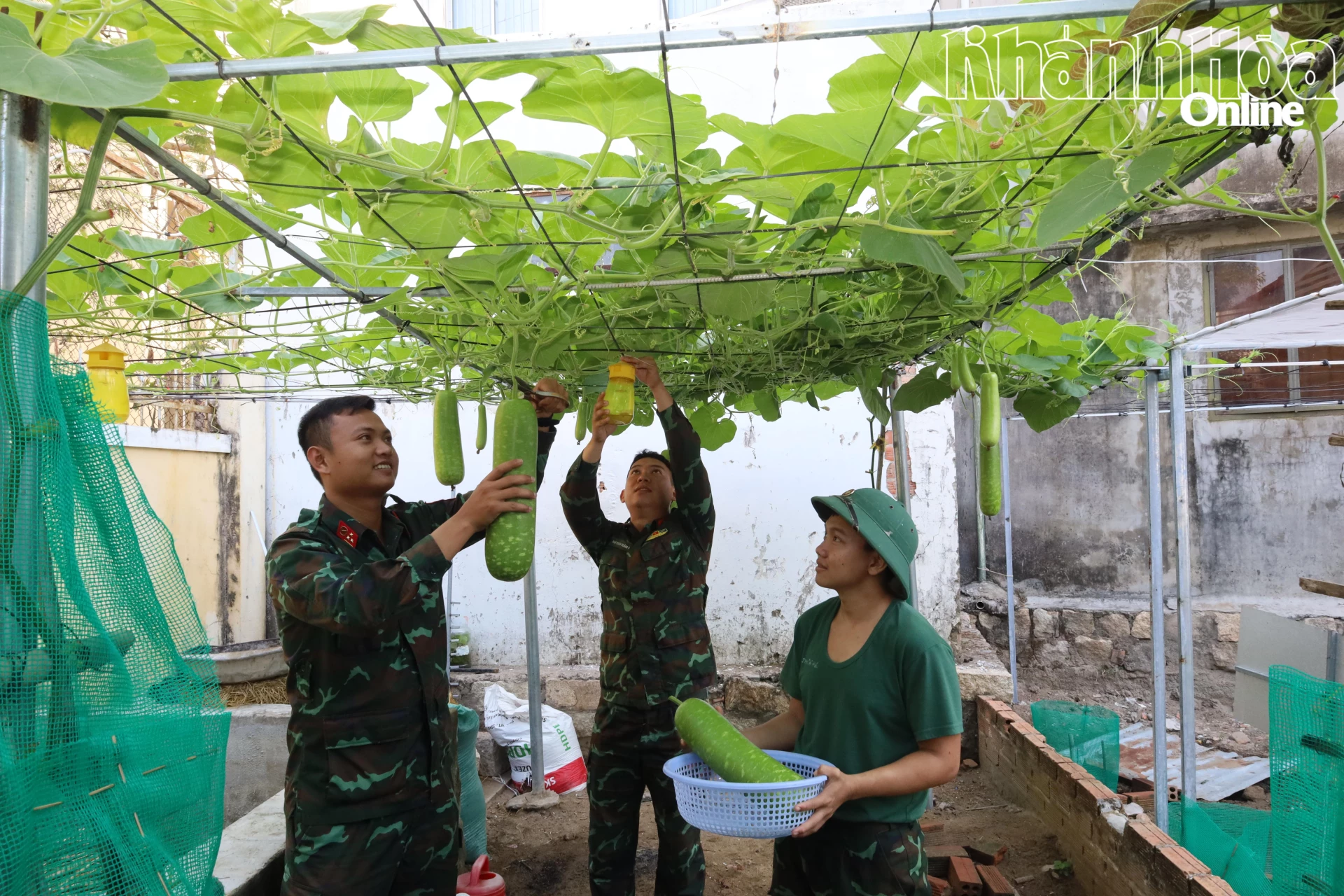 Cán bộ, chiến sĩ thu hoạch bầu để cải thiện bữa ăn cho bộ đội.