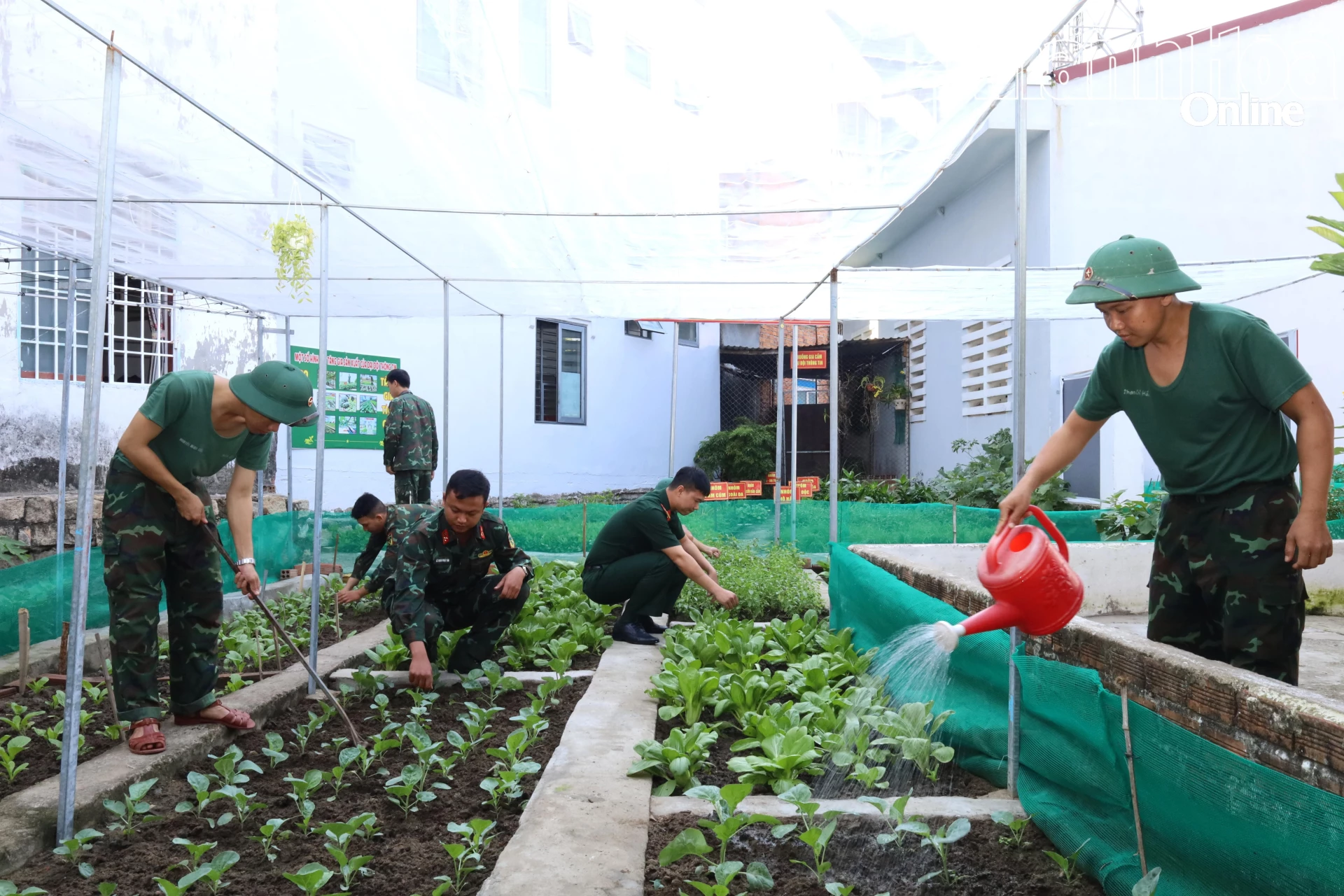 Cán bộ, chiến sĩ chăm sóc vườn rau xanh.