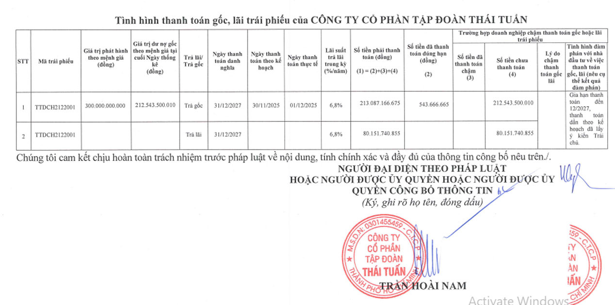 Giải trình việc chưa trả được cả gốc và lãi trái phiếu, Thái Tuấn cho biết doanh nghiệp đã được trái chủ chấp thuận gia hạn thời gian thanh toán đến tháng 12/2027, thanh toán dần theo kế hoạch đã lấy ý kiến của trái chủ.