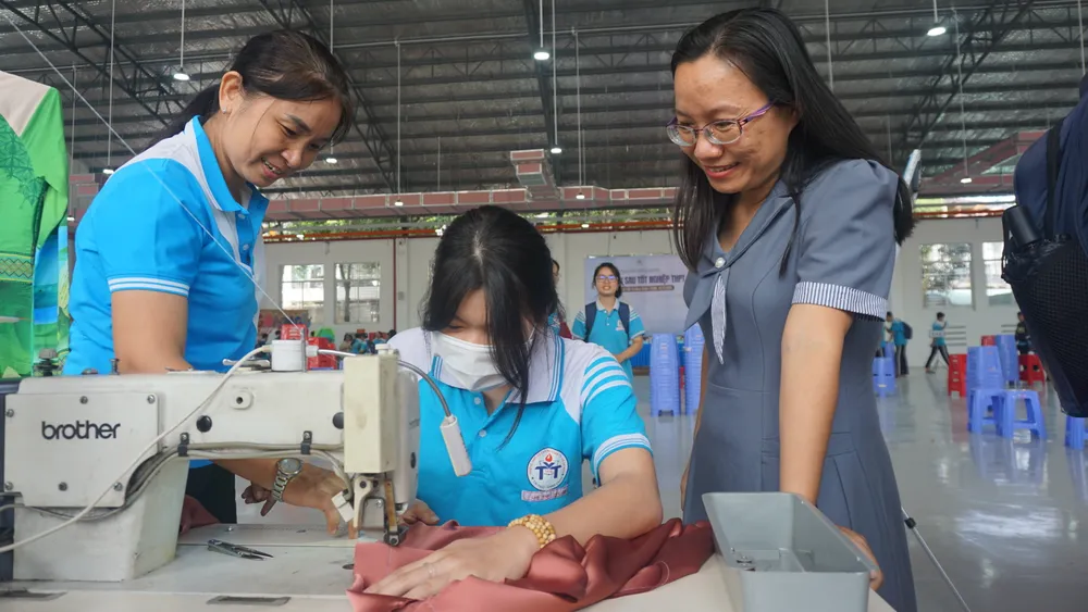 Học sinh Trường THPT Võ Trường Toản, phường Tân Thới Hiệp trải nghiệm nghề may tại Ngày hội hướng nghiệp. Ảnh: NQ