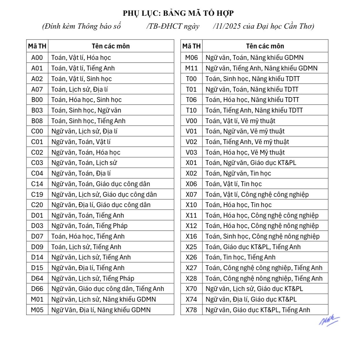 Chi tiết bảng tổ hợp xét tuyển đại học chính quy năm 2026 của Đại học Cần Thơ.