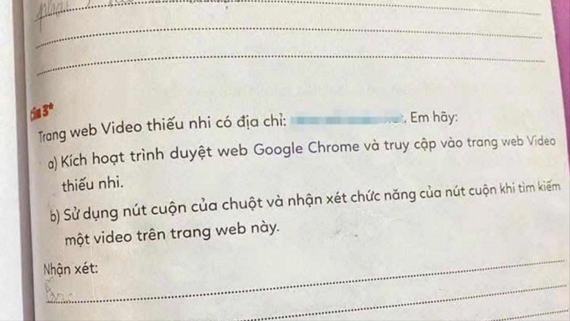 Cụ thể, tại một trang trong cuốn sách của NXB Đại học Huế có câu hỏi với nội dung yêu cầu học sinh sử dụng trình duyệt Google Chrome để truy cập vào trang web video thiếu nhi.