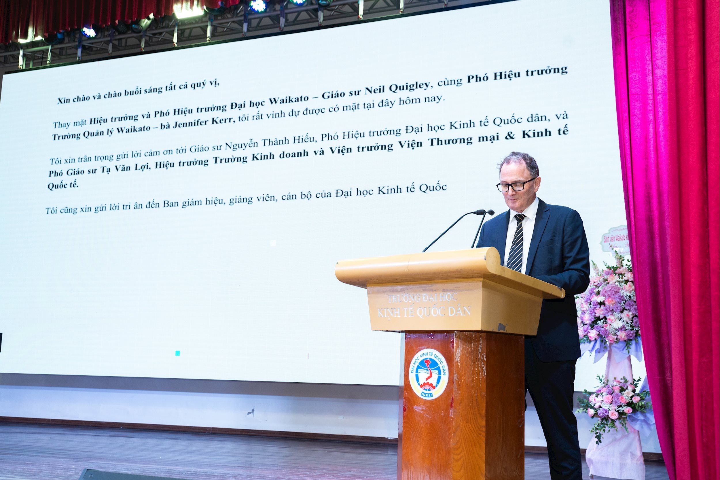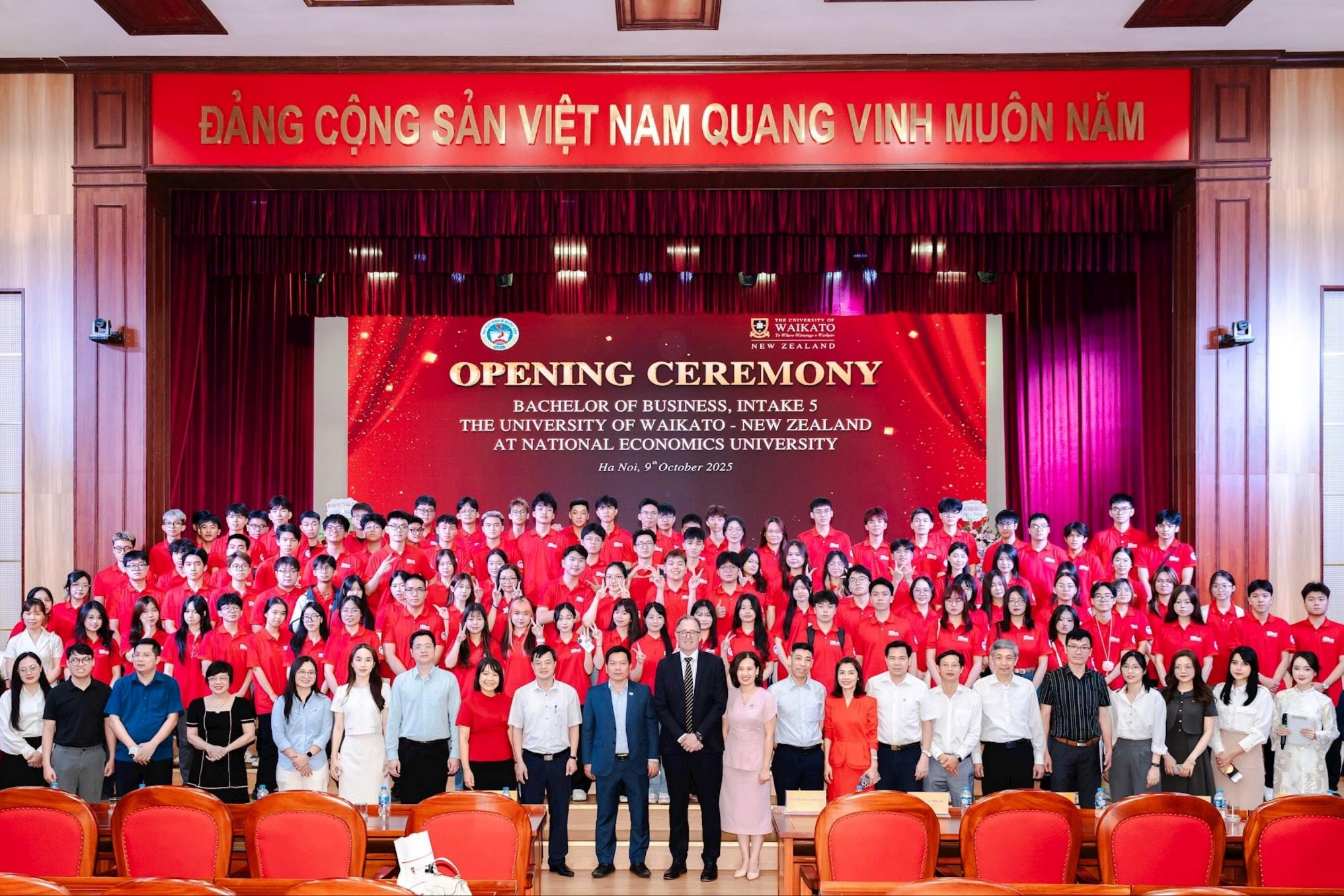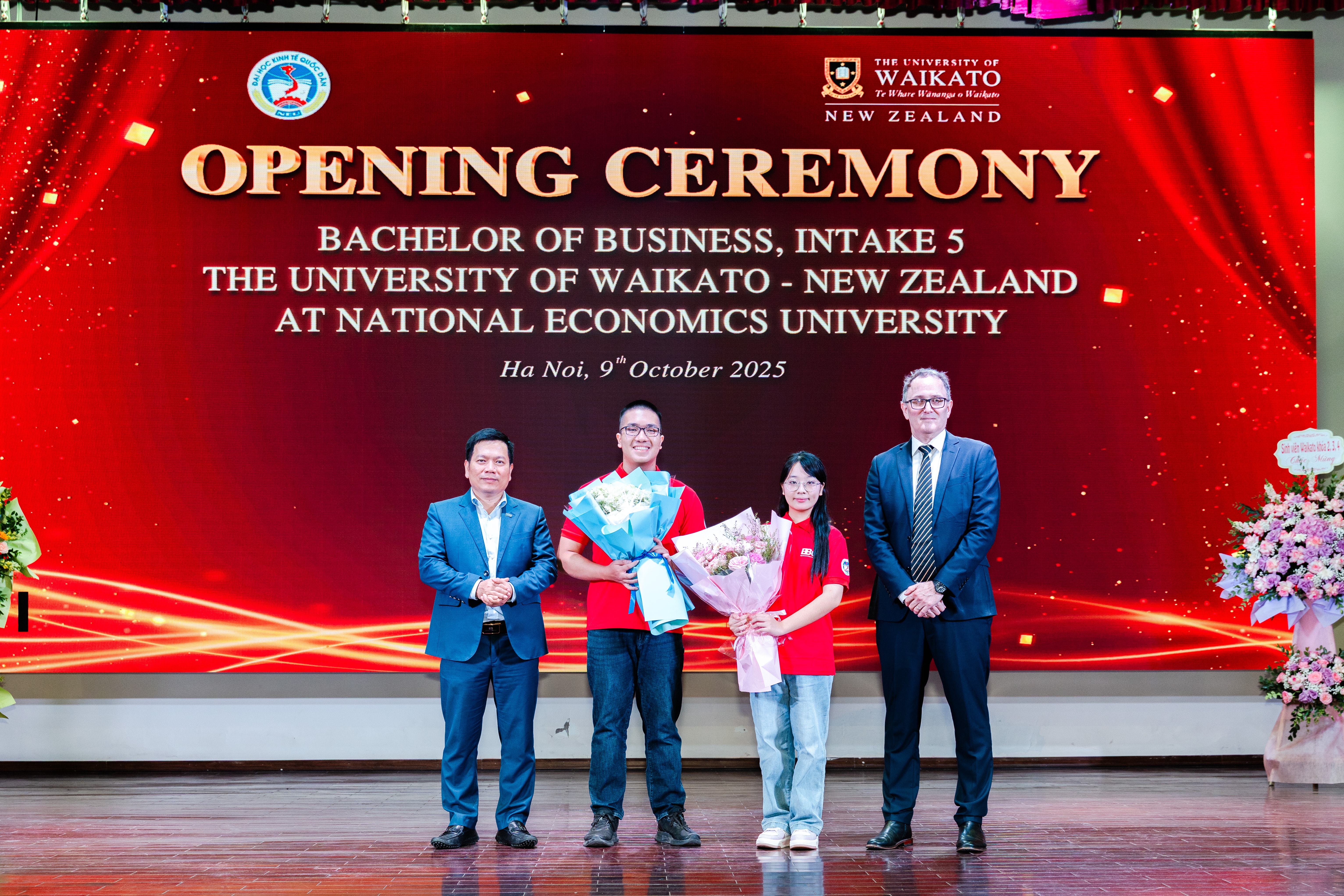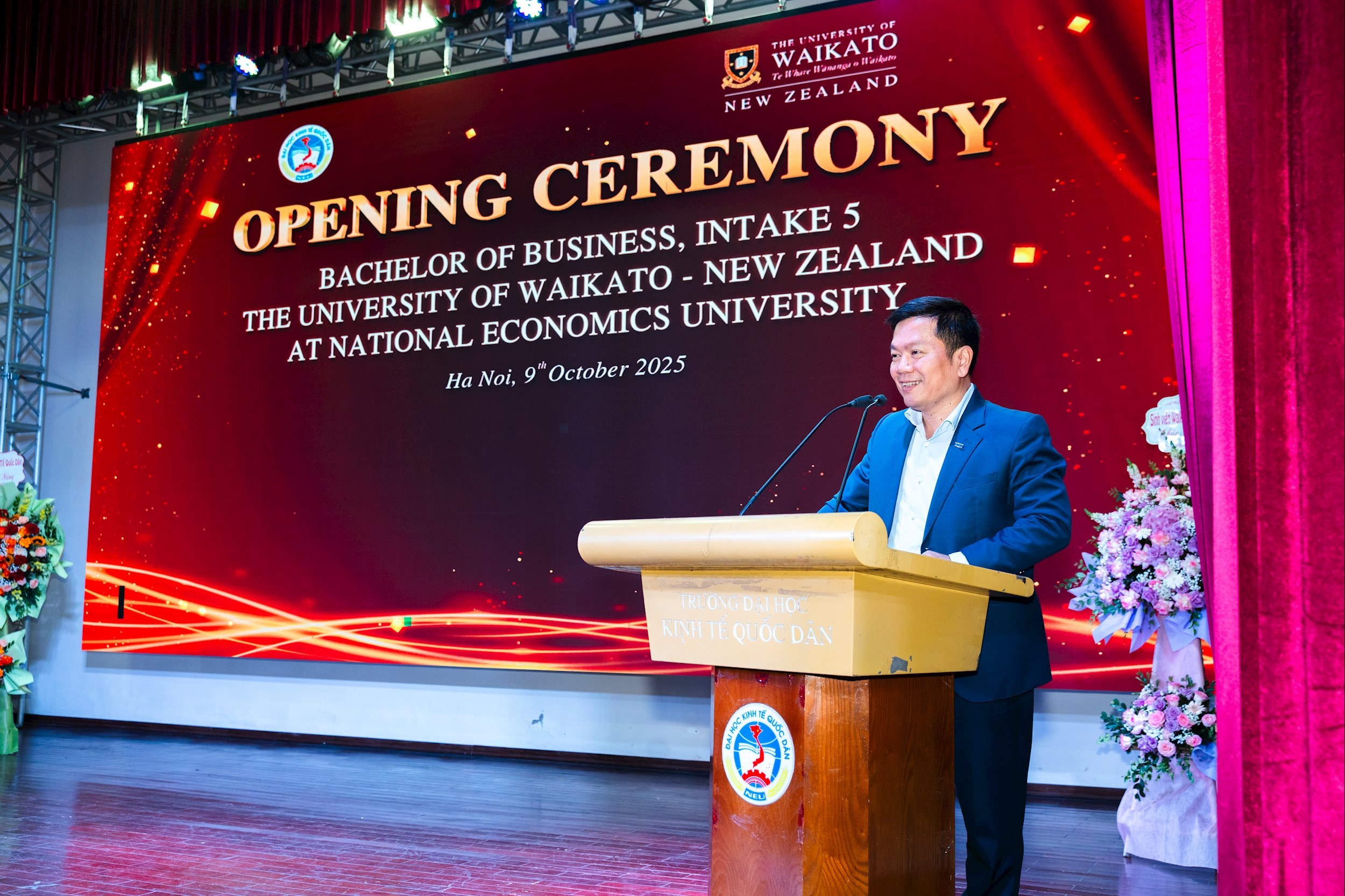 Phát biểu tại buổi lễ, GS.TS Nguyễn Thành Hiếu, Phó Giám đốc Đại học Kinh tế Quốc dân đã chúc mừng các tân sinh viên chính thức trở thành một phần của chương trình xuất sắc của Đại học Waikato và Đại học Kinh tế Quốc dân. Đây là khóa tuyển sinh thứ năm của chương trình liên kết thành công giữa Đại học Waikato (New Zealand) và Đại học Kinh tế Quốc dân (Việt Nam).