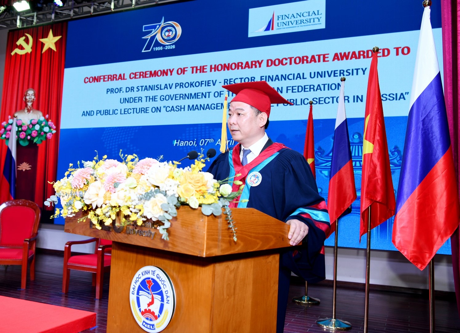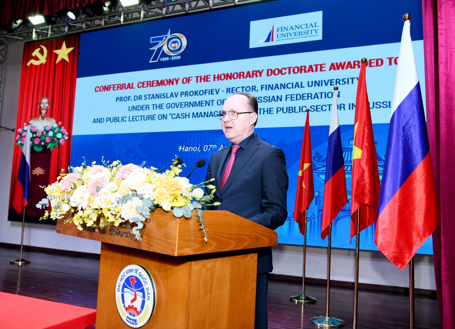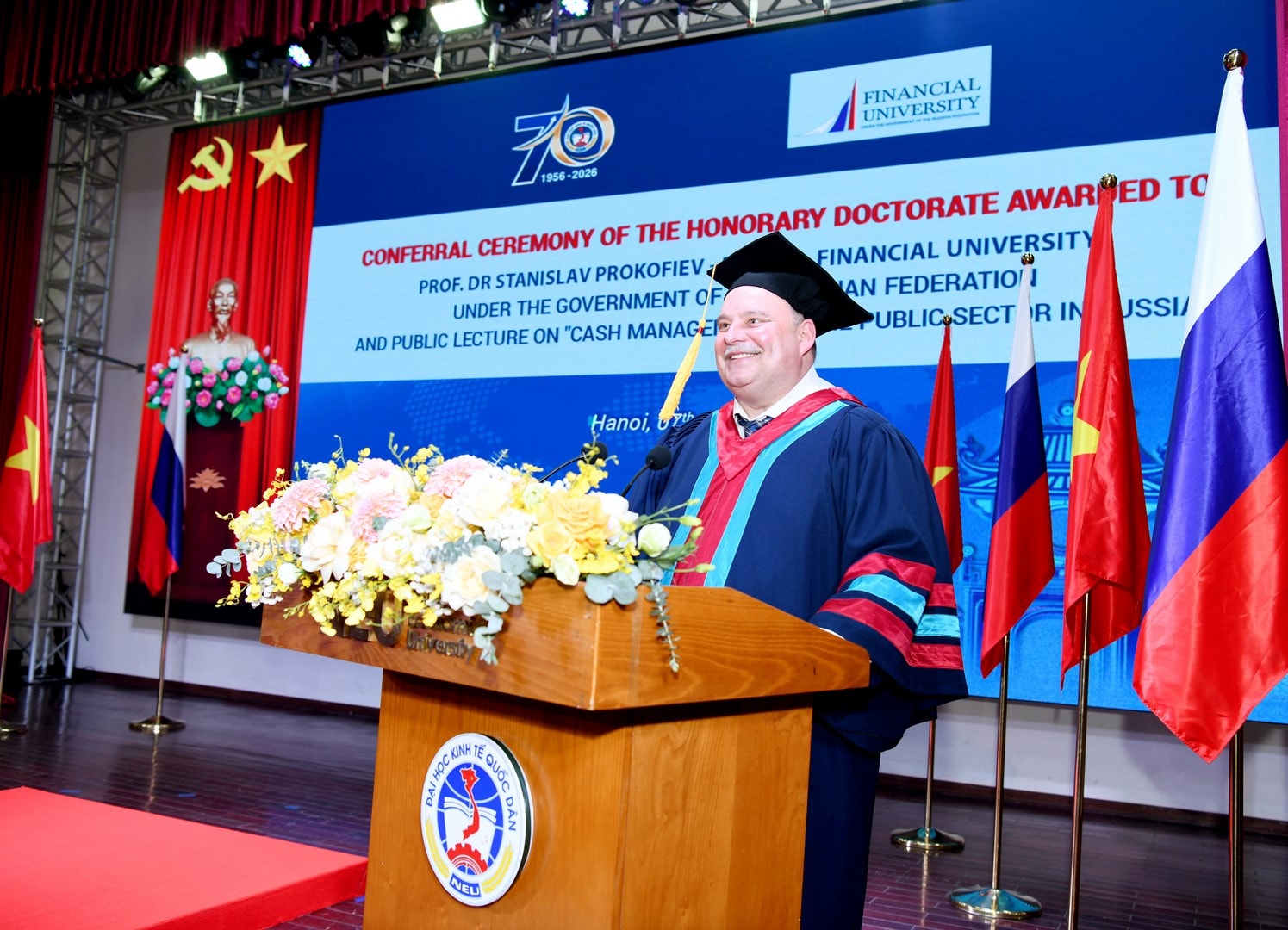 Phát biểu tại lễ trao bằng Tiến sĩ Danh dự cho GS.TS Stanislav Evgenievich Prokofiev, PGS.TS Bùi Huy Nhượng, Giám đốc Đại học Kinh tế Quốc dân cho biết, Đại học Kinh tế Quốc dân là một trong những cơ sở đào tạo hàng đầu của Việt Nam trong lĩnh vực kinh tế, quản lý và quản trị kinh doanh. Trải qua hơn 70 năm xây dựng và phát triển, với đội ngũ học thuật vững mạnh cùng vai trò tư vấn chính sách quan trọng, nhà trường luôn kiên định theo đuổi mục tiêu nâng cao chất lượng đào tạo, đổi mới sáng tạo và hội nhập quốc tế.