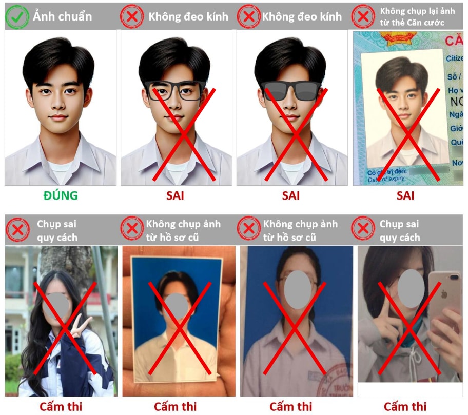Ảnh chân dung (bản điện tử, định dạng .jpg hoặc .jpeg, dung lượng không quá 5MB, kích thước 4x6 cm, đặt tên là số thẻ căn cước):Ảnh chụp trên phông nền sáng màu, mắt nhìn thẳng, đầu để trần, không đeo kính. Ảnh được chụp trong 06 tháng tính đến thời điểm đăng ký dự thi. Ảnh chân dung được sử dụng để nhận diện vào phòng thi và in trên Phiếu báo điểm.