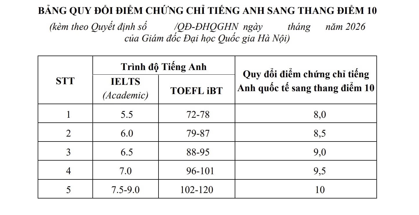 Đại học Quốc gia Hà Nội quy định cụ thể mức quy đổi chứng chỉ tiếng Anh quốc tế sang thang điểm 10.