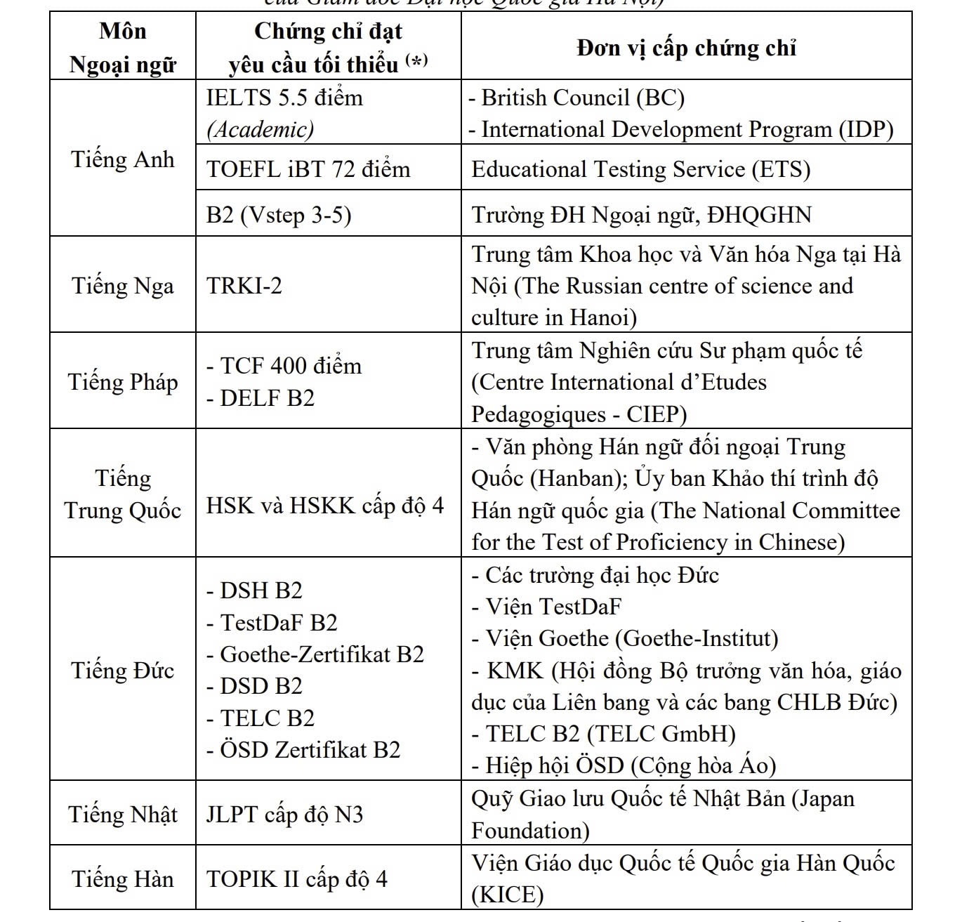 Ngoài ra, thí sinh cũng cần nắm rõ các chứng chỉ ngoại ngữ được sử dụng trong tuyển sinh đại học năm 2026 của Đại học Quốc gia Hà Nội.