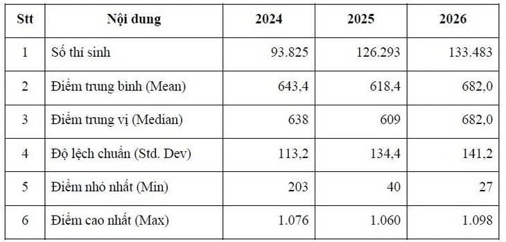 Thống kê các đặc trưng của kết quả thi đánh giá năng lực Đại học Quốc gia TP. Hồ Chí Minhnăm 2024, 2025, 2026 (đợt 1)