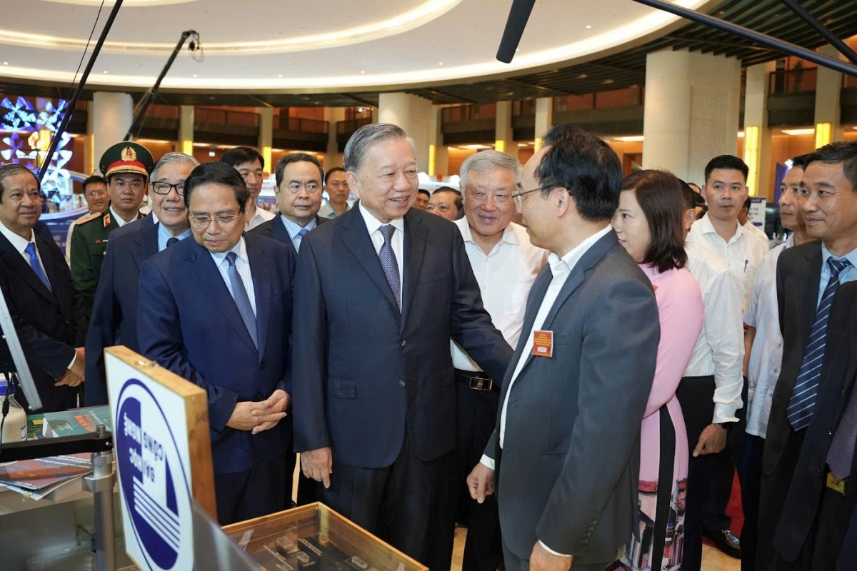 Giám đốc ĐHQGHN Hoàng Minh Sơn giới thiệu với Tổng Bí thư Tô Lâm các sản phẩm khoa học – công nghệ mũi nhọn của trường