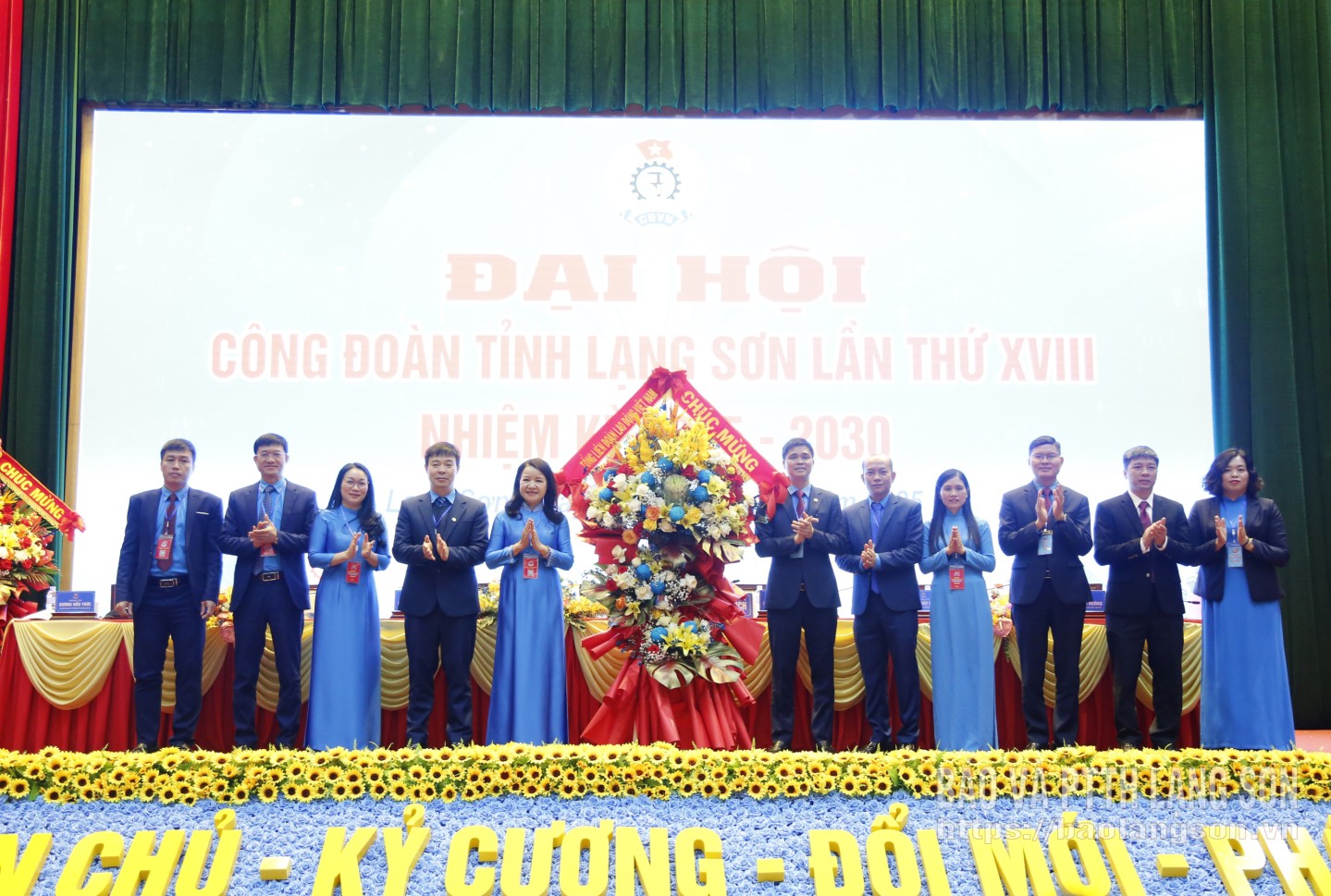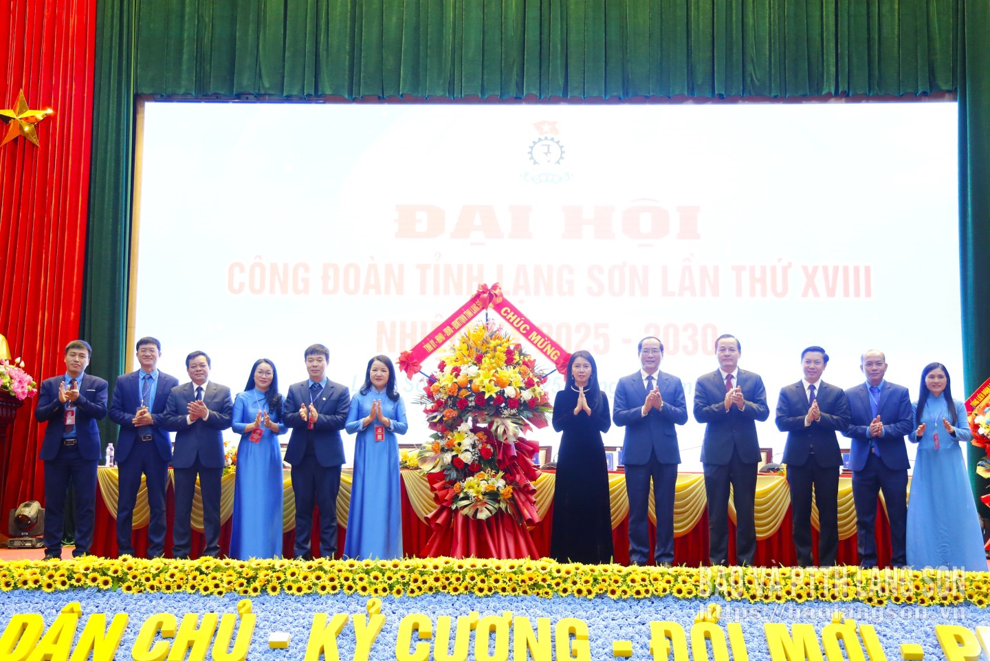 Các đồng chí lãnh đạo Tổng Liên đoàn Lao động Việt Nam, lãnh đạo tỉnh tặng hoa chúc mừng Ban Chấp hành Liên đoàn Lao động tỉnh khóa XVIII