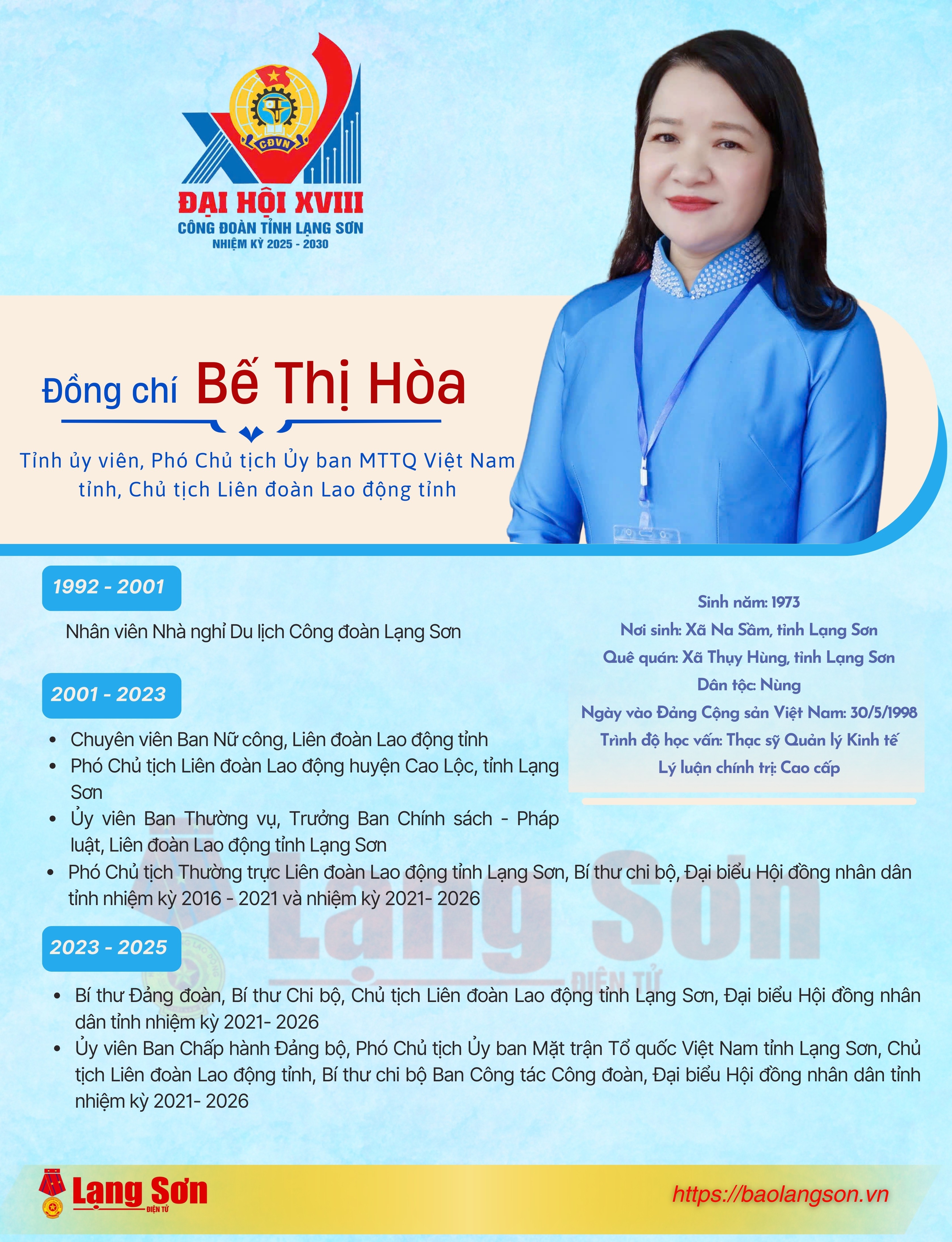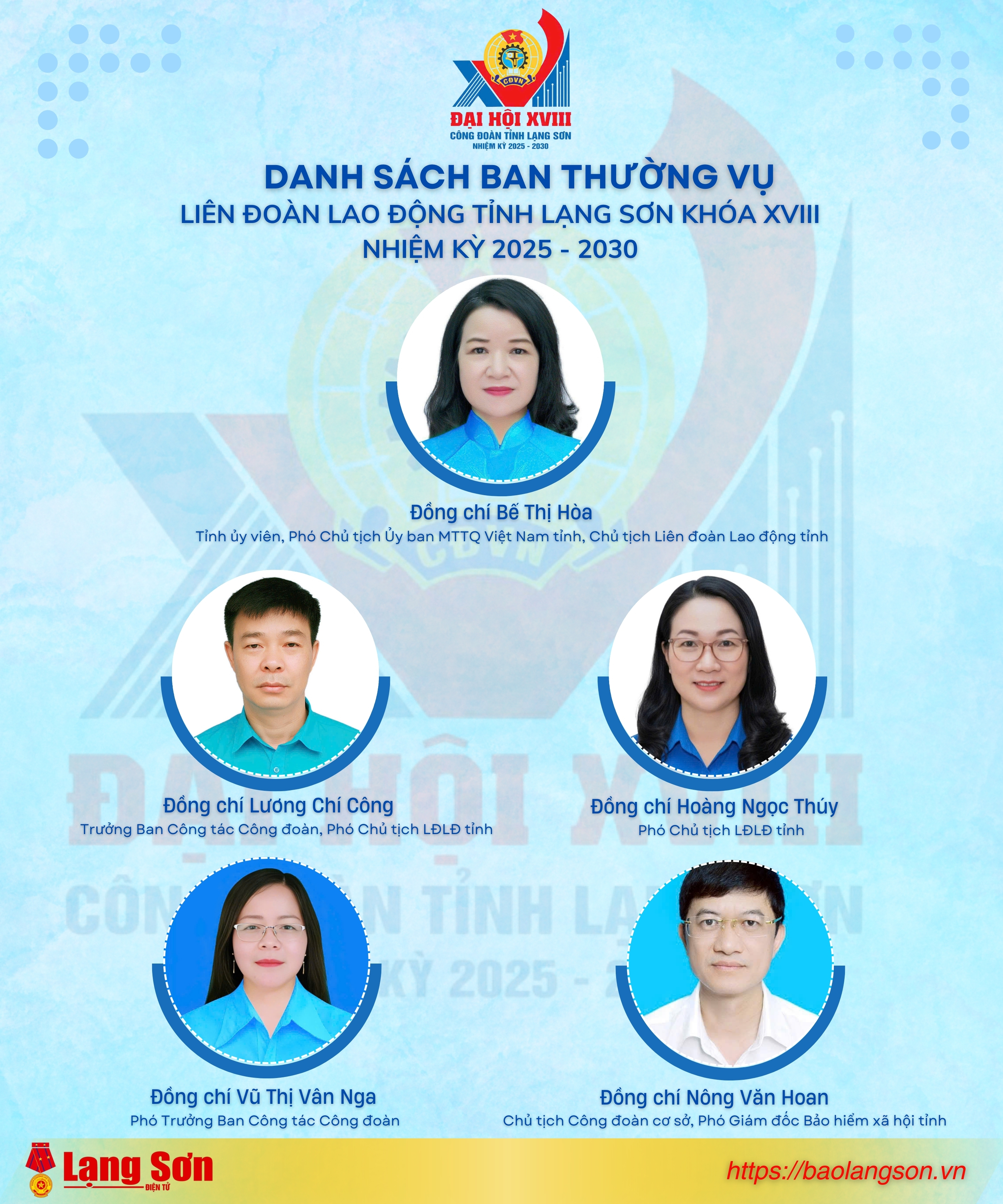 Đại hội đã ra mắt Ban Chấp hành LĐLĐ tỉnh gồm 19 đồng chí. Đồng chí Bế Thị Hòa, Chủ tịch LĐLĐ tỉnh khóa XVII tái đắc cử giữ chức vụ Chủ tịch LĐLĐ tỉnh khóa XVIII nhiệm kỳ 2025 - 2030.