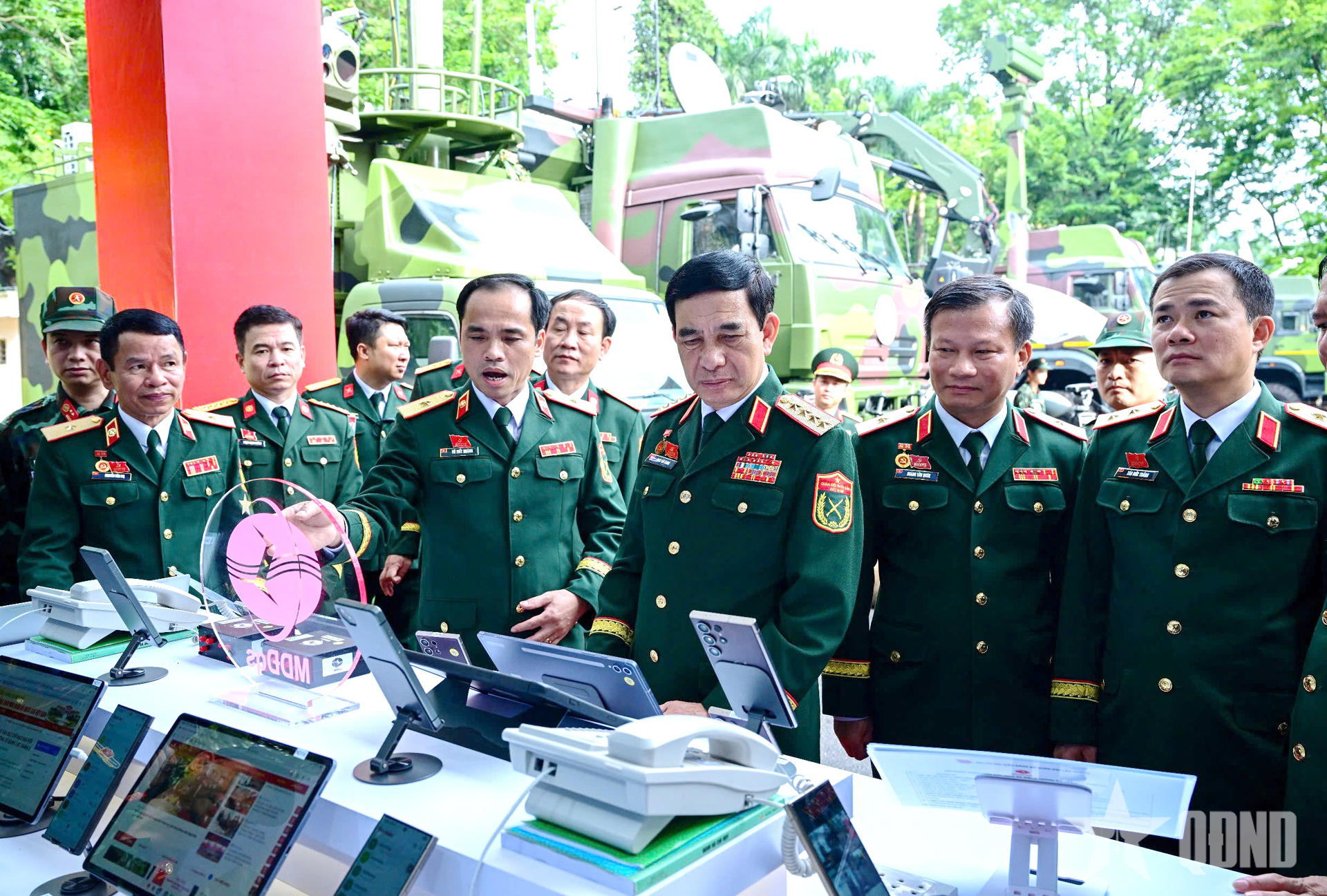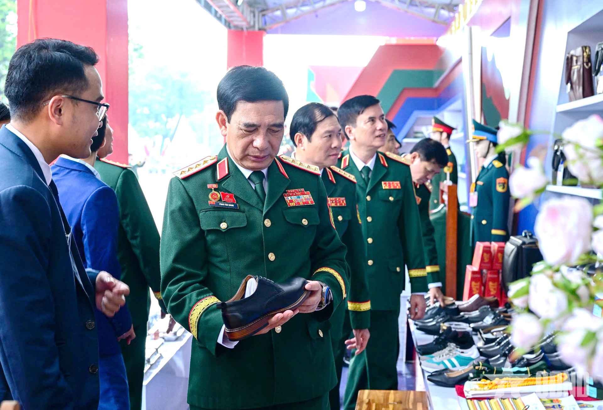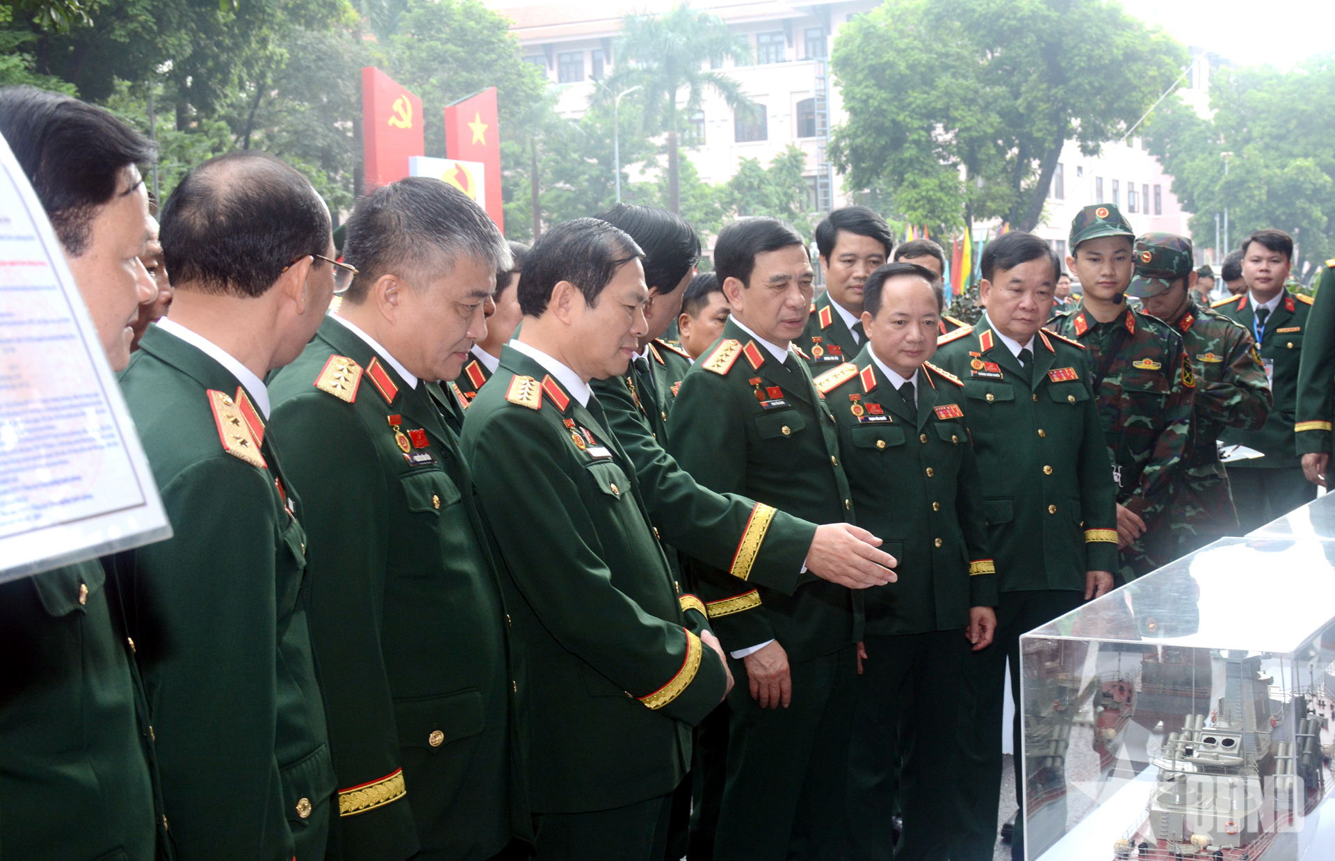 Đại tướng Phan Văn Giang, các đồng chí lãnh đạo Bộ Quốc phòng cùng các đại biểu tham quan các gian trưng bày phục vụ đại hội.