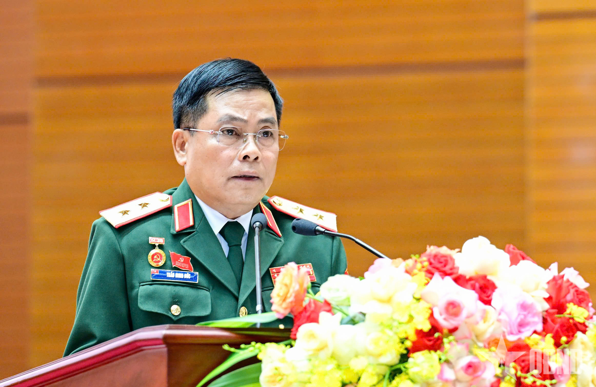 Trung tướng Trần Minh Đức, Phó bí thư Đảng ủy, Chủ nhiệm Tổng cục Hậu cần - Kỹ thuật mở đầu nội dung phát biểu tham luận tại phiên làm việc ngày thứ hai.