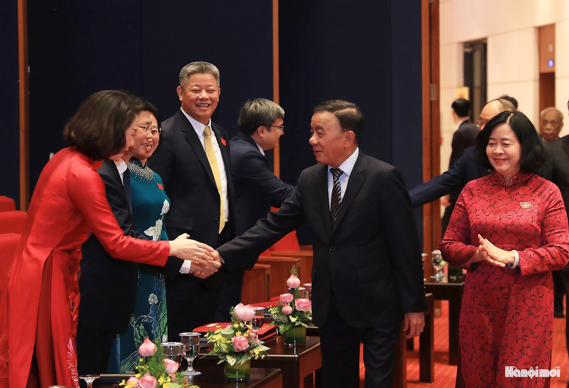 Bí thư Thành ủy Hà Nội Bùi Thị Minh Hoài cùng các đồng chí lãnh đạo thành phố Hà Nội tặng hoa chúc mừng các đồng chí thôi tham gia Ban Chấp hành Đảng bộ thành phố khóa XVIII.