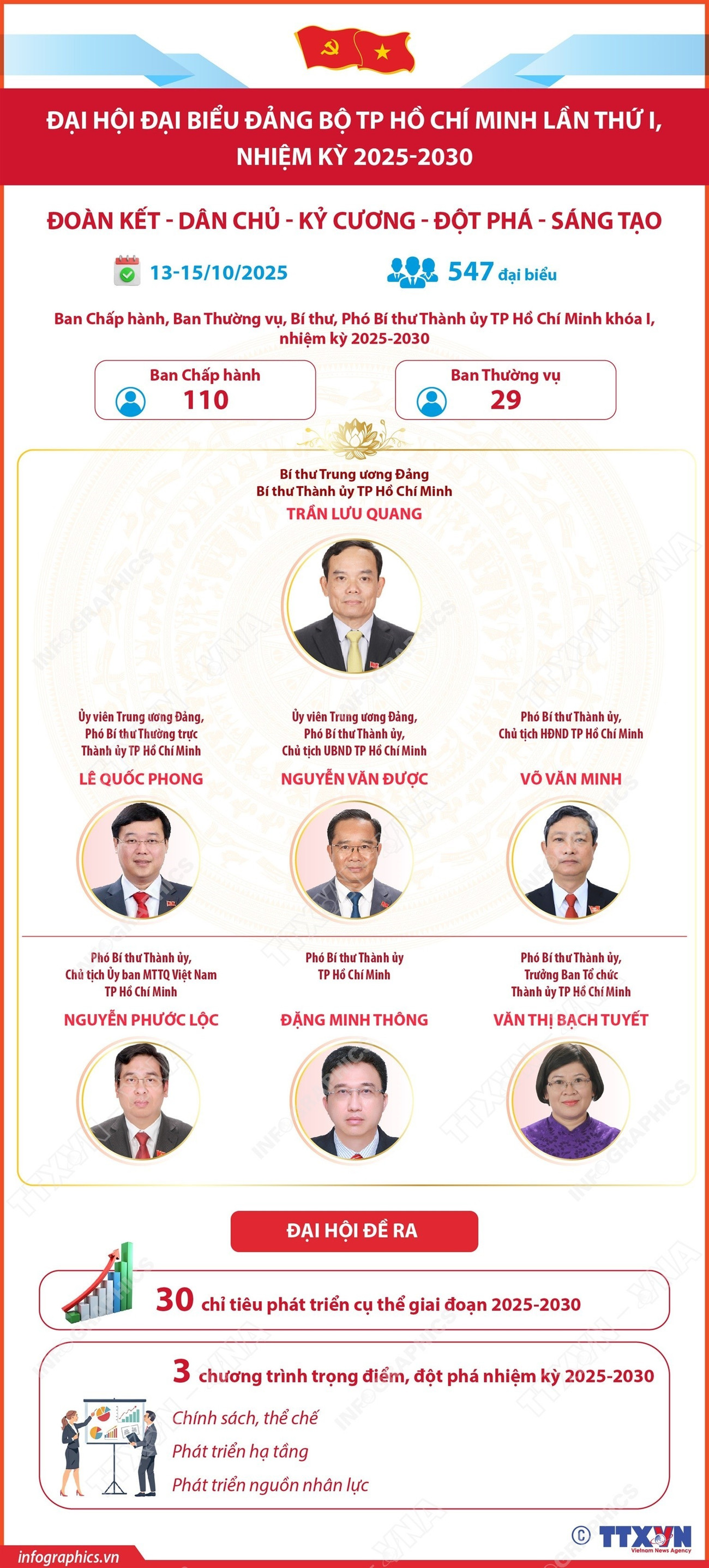 Nghị quyết đại hội Đảng bộ Thành phố Hồ Chí Minh lần thứ I, nhiệm kỳ 2025-2030 đã đề ra 30 chỉ tiêu phát triển cụ thể giai đoạn 2025-2030 và 3 chương trình trọng điểm, đột phá nhiệm kỳ 2025-2030, nhằm mục tiêu hướng tới 100 năm thành lập Đảng (2030), Thành phố trở thành một đô thị văn minh, hiện đại, trung tâm đổi mới sáng tạo, năng động, hội nhập, đi đầu trong sự nghiệp công nghiệp hóa, hiện đại hóa đất nước, có vị trí nổi trội ở khu vực Đông Nam Á, nằm trong nhóm 100 thành phố toàn cầu, đáng sống và có hệ sinh thái đổi mới sáng tạo của thế giới, thuộc nhóm thu nhập cao.