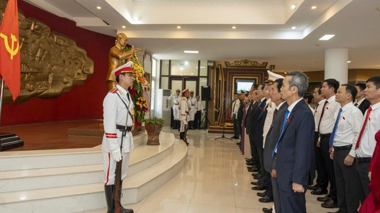 Ban Thường vụ Thành ủy khóa XVI và các trưởng đoàn dâng hoa tại Bảo tàng Hồ Chí Minh.