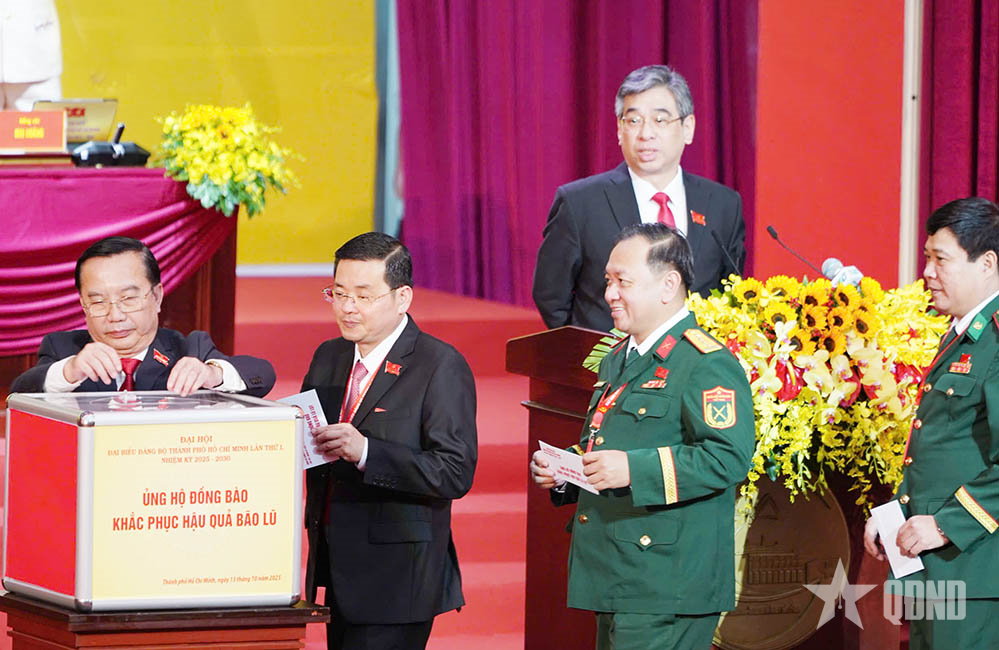 Các đại biểu dự đại hội đóng góp ủng hộ đồng bào bị thiệt hại do thiên tai.