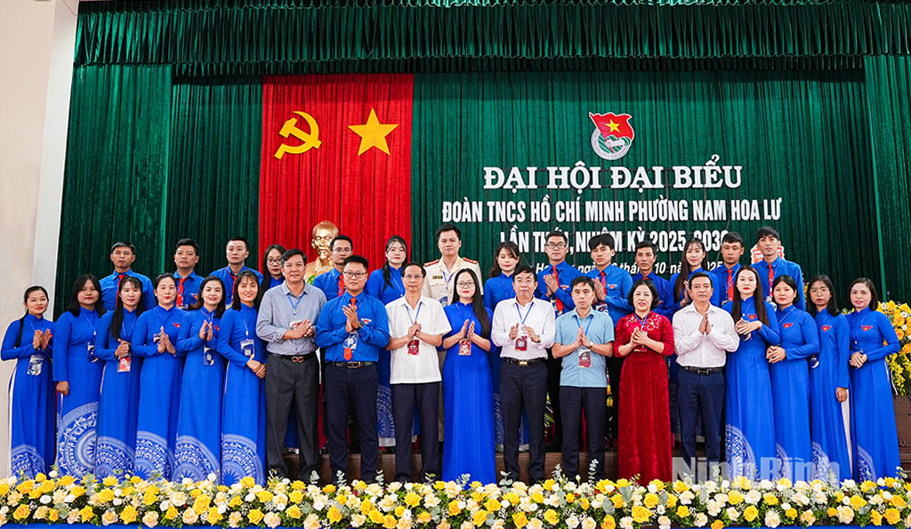 Các đại biểu chụp ảnh lưu niệm với Ban Chấp hành Đoàn phường Nam Hoa Lư nhiệm kỳ 2025 - 2030. Ảnh: Nguyễn Huy