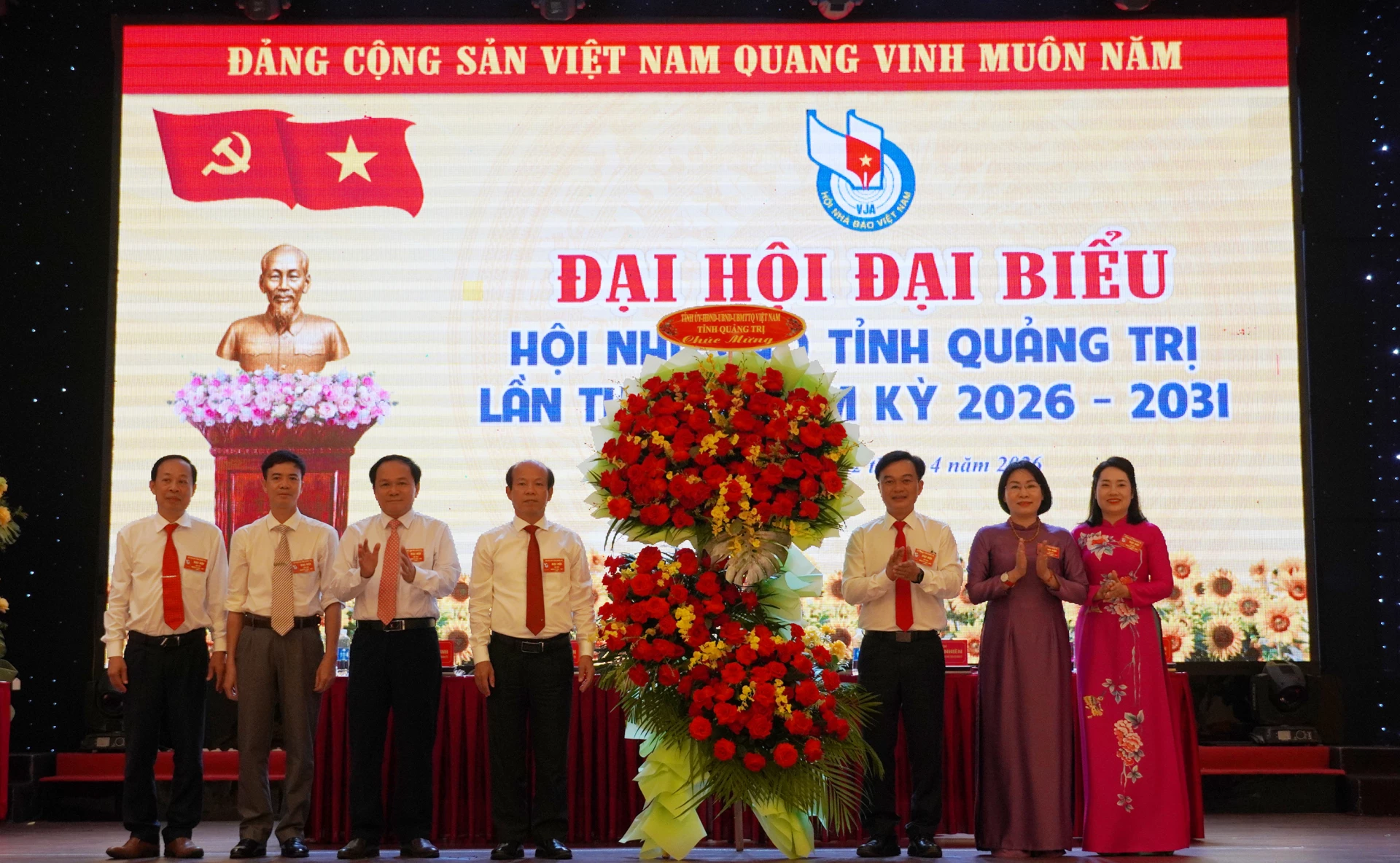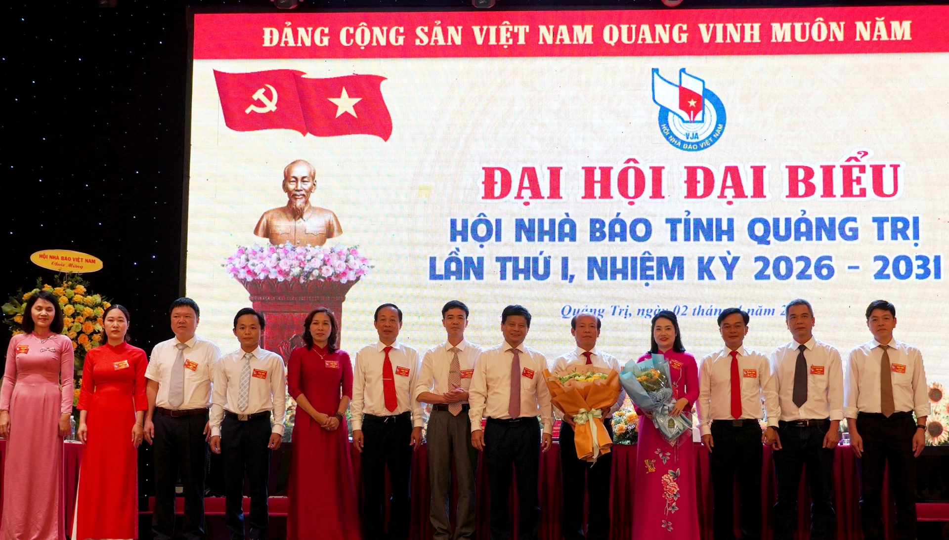 Đồng chí Trần Trọng Dũng, Phó Chủ tịch Hội Nhà báo Việt Nam và đồng chí Nguyễn Chiến Thắng, Phó Bí thư Tỉnh ủy, Chủ tịch Ủy ban MTTQ Việt Nam tỉnh tặng hoa chúc mừng Ban Chấp hành Hội Nhà báo tỉnh Quảng Trị khóa I, nhiệm kỳ 2026-2031 - Ảnh: X.P