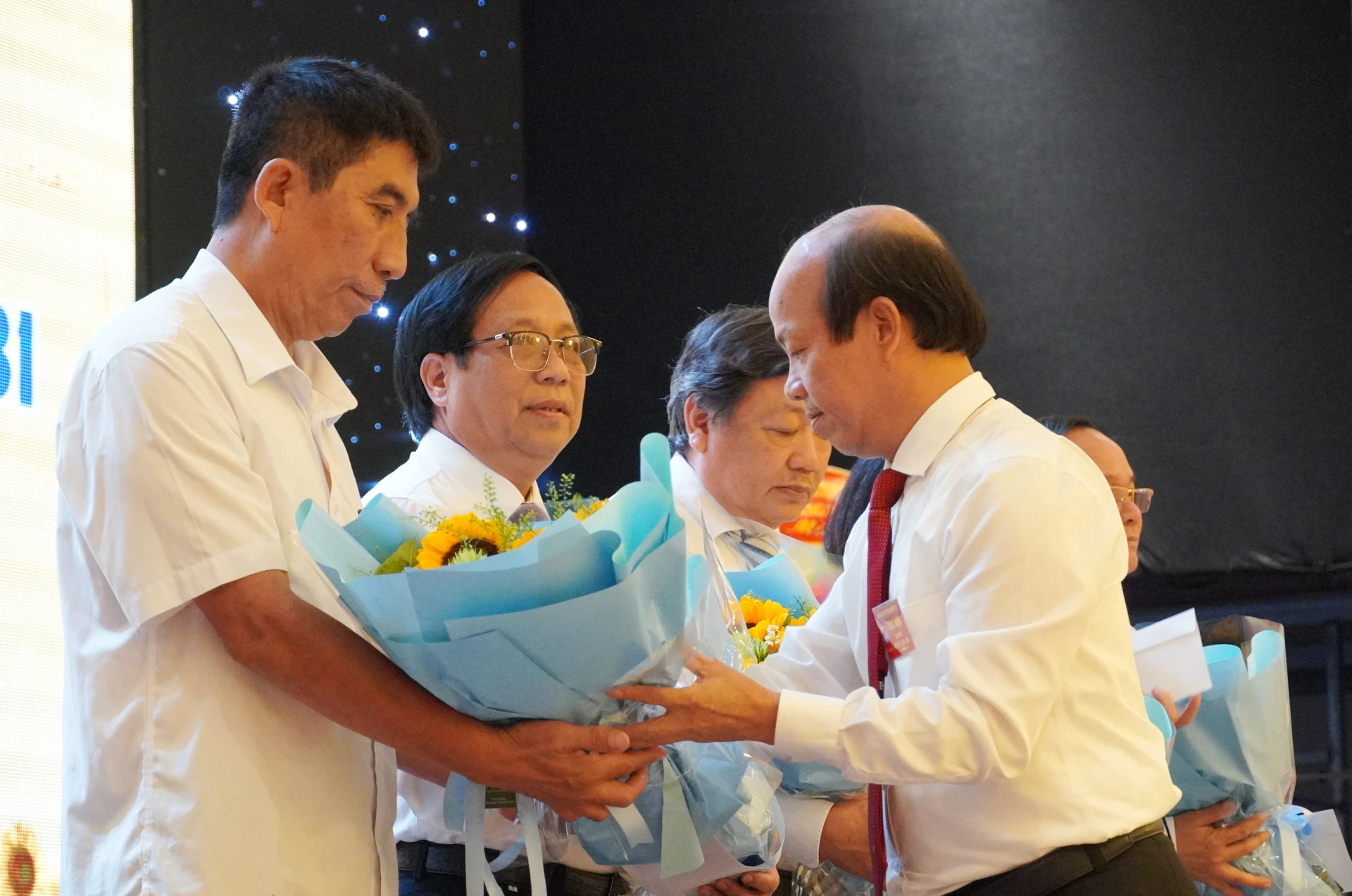 Đồng chí Võ Nguyên Thủy, Giám đốc Báo và phát thanh, truyền hình Quảng Trị, Chủ tịch Hội Nhà báo tỉnh Quảng Trị khóa I, nhiệm kỳ 2026-2031 tặng hoa các đồng chí không tham gia Ban Chấp hành khóa mới - Ảnh: X.P