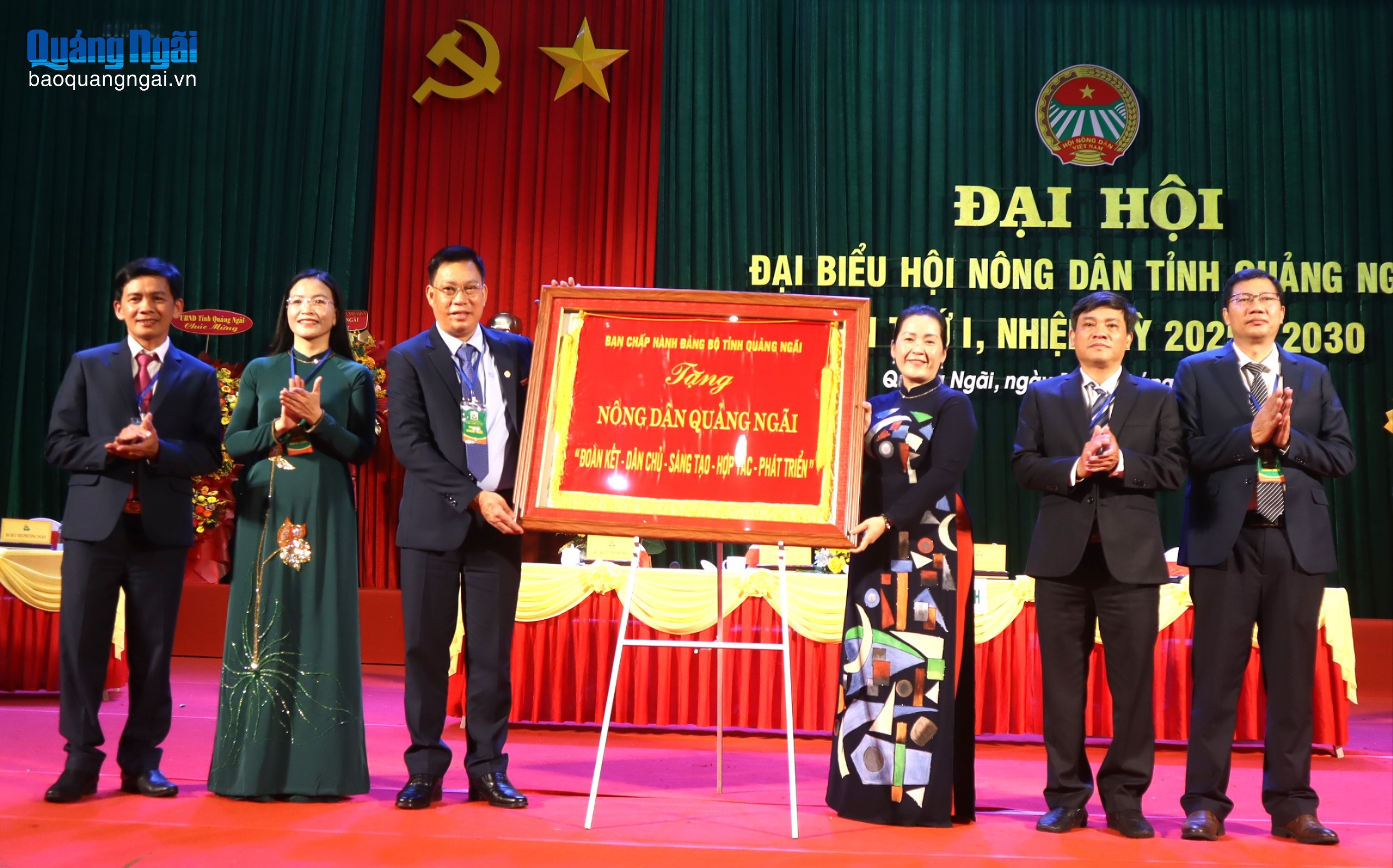 Nhân dịp này, Phó Bí thư Tỉnh ủy Đinh Thị Hồng Minh cũng đã trao tặng bức trướng của Ban Chấp hành Đảng bộ tỉnh cho Hội Nông dân tỉnh mang dòng chữ: “Đoàn Kết - Dân chủ - Sáng tạo - Hợp tác - Phát triển”.