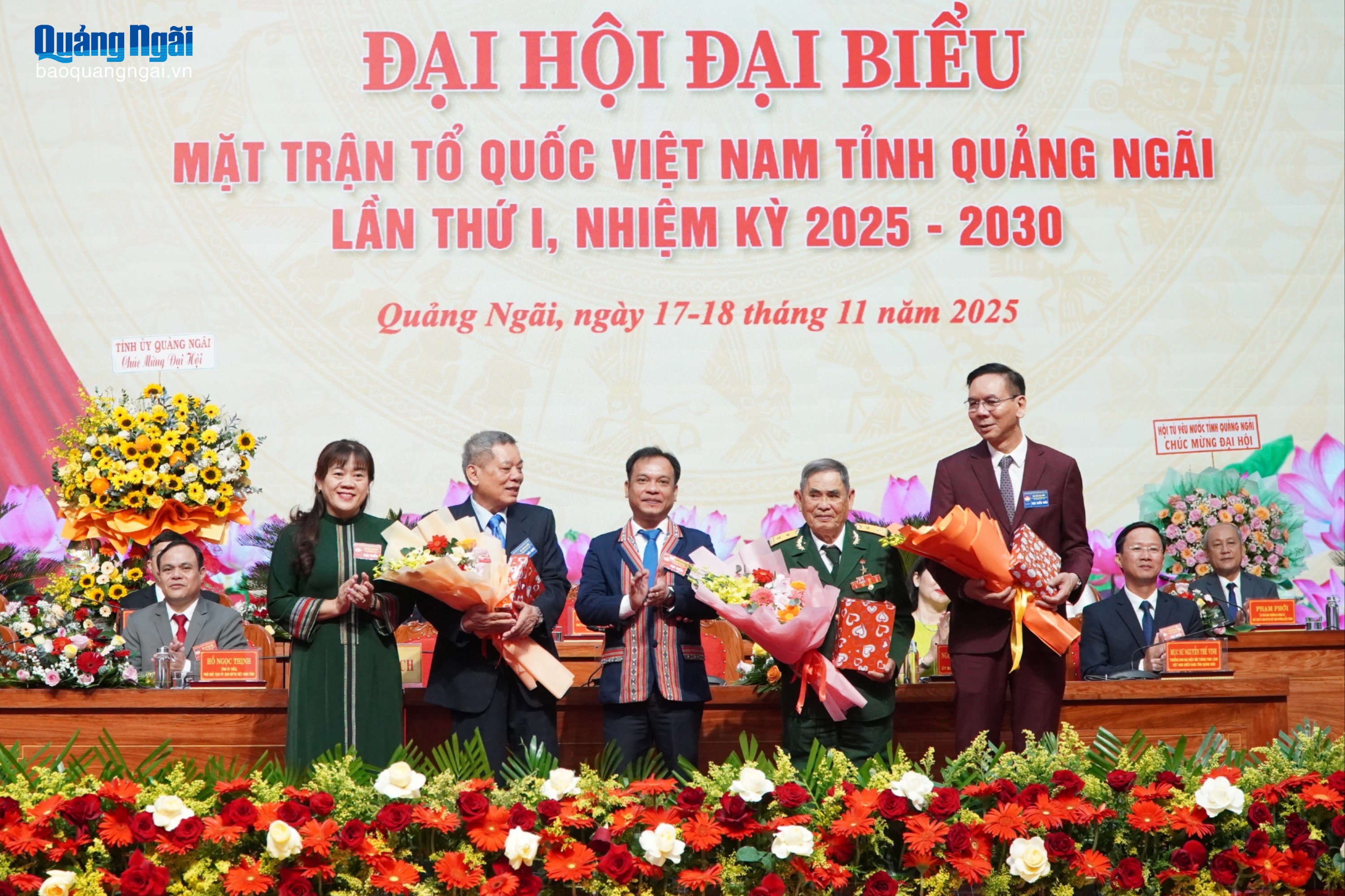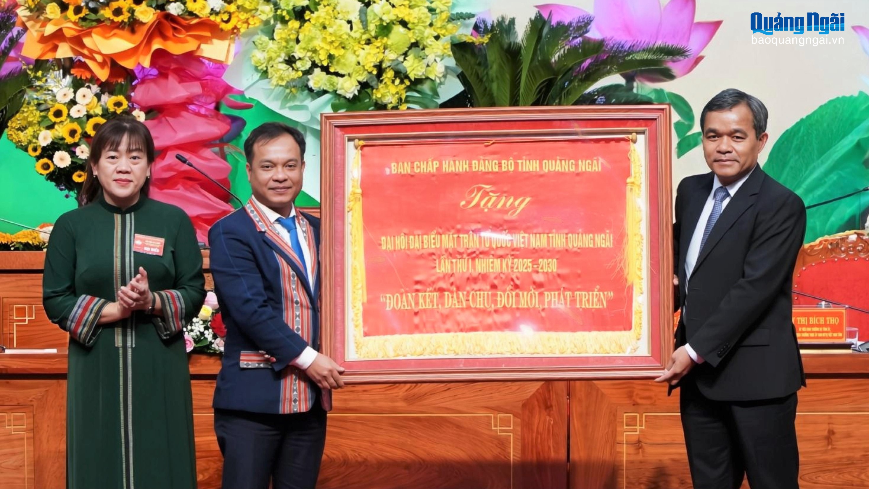 Bí thư Tỉnh ủy Hồ Văn Niên và Trưởng Ban Dân tộc và Tôn giáo Ủy ban Trung ương MTTQ Việt Nam Nguyễn Văn Thanh tặng hoa chúc mừng Ủy ban MTTQ Việt Nam tỉnh khóa I, nhiệm kỳ 2025- 2030.