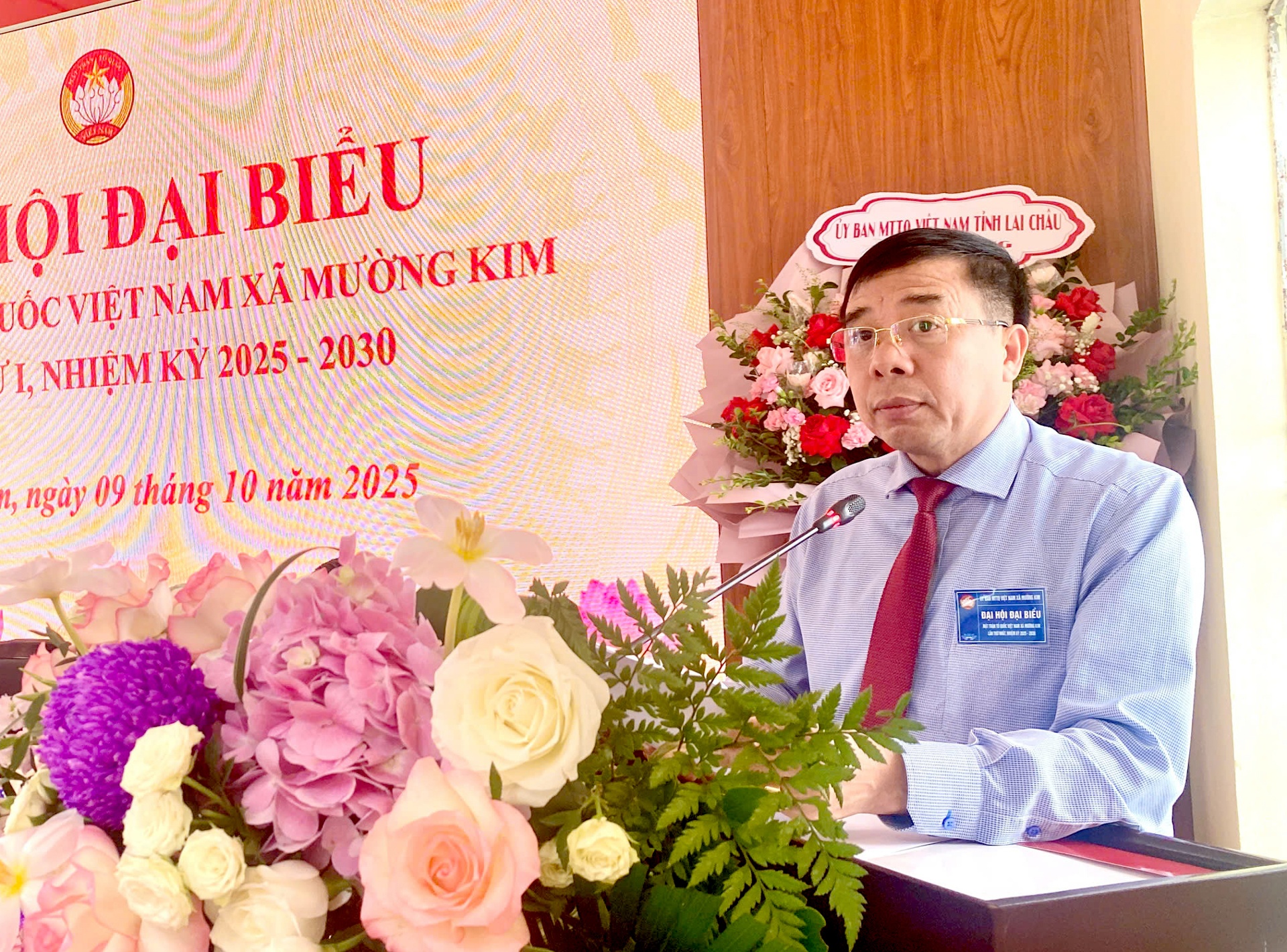 Phát biểu tại đại hội, các đồng chí: Hoàng Thọ Trung - Phó Chủ tịch Ủy ban MTTQ Việt Nam tỉnh, Chủ tịch Liên đoàn Lao động tỉnh; Đoàn Văn Đạt – Phó Bí thư Thường trực Đảng ủy xã Mường Kim chúc mừng những kết quả đạt được của Ủy ban MTTQ Việt Nam xã Mường Kim trong nhiệm kỳ qua. Đồng thời đề nghị, nhiệm kỳ mới, Ủy ban MTTQ Việt Nam xã Mường Kim sẽ tiếp tục phát huy sức mạnh đại đoàn kết toàn dân tộc; khơi dậy ý chí tự lực, tự cường của nhân dân trong phát triển kinh tế, xã hội, giảm nghèo bền vững tại địa phương. Không ngừng đổi mới nội dung, phương thức hoạt động, tích cực thực hiện chuyển đổi số gắn với đẩy mạnh các phong trào thi đua yêu nước để người dân tham gia. Duy trì và nhân rộng các mô hình hay, tấm gương điển hình trên các lĩnh vực góp phần thực hiện thắng lợi mục tiêu, nhiệm vụ Đại hội Đảng bộ xã nhiệm kỳ 2025-2030 đề ra.