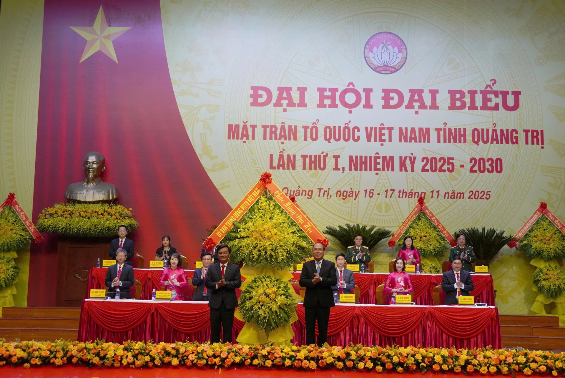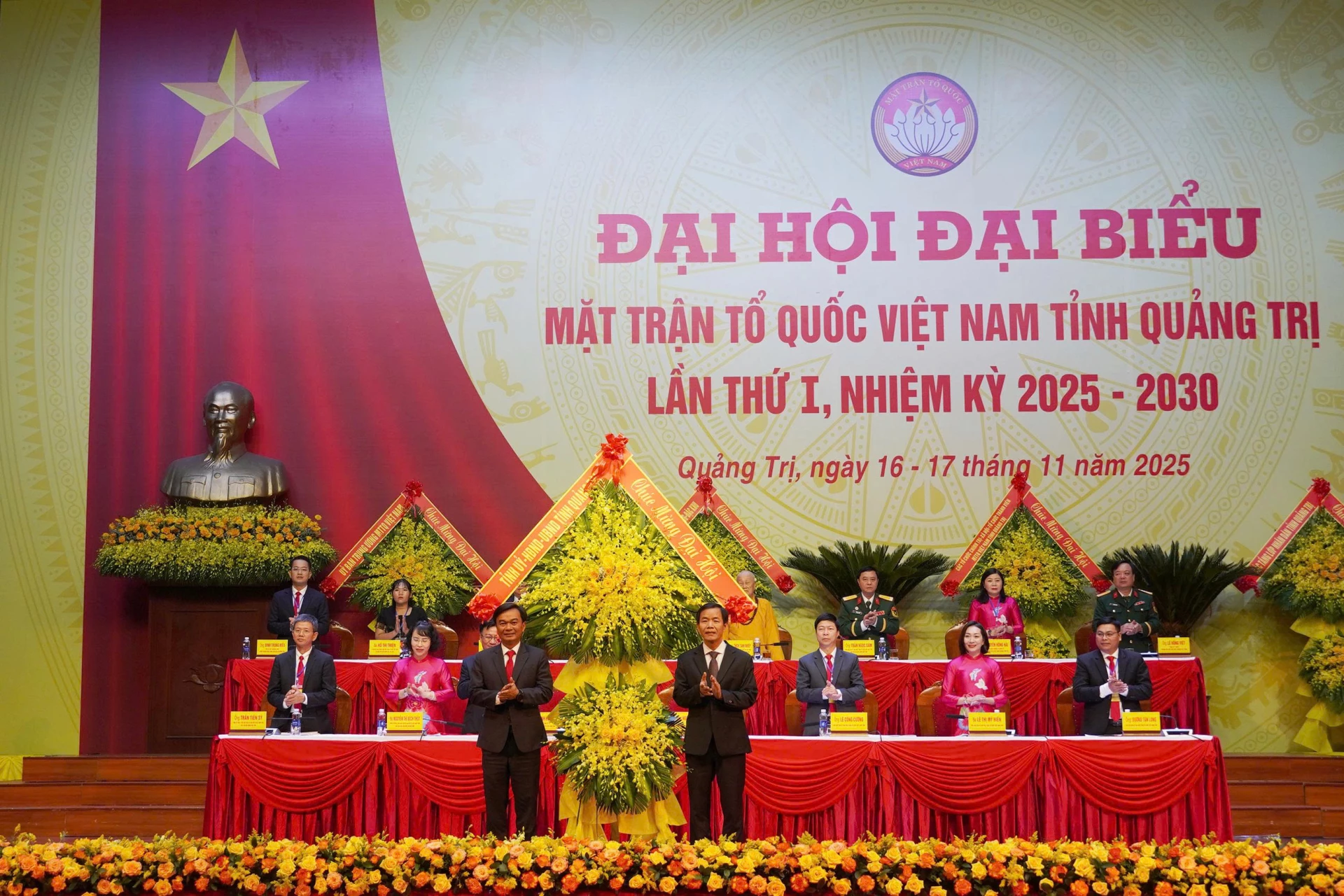 Đồng chí Hoàng Công Thủy, Phó Chủ tịch Ủy ban Trung ương MTTQ Việt Nam và đồng chí Nguyễn Văn Phương, Bí thư Tỉnh ủy Quảng Trị tặng hoa chúc mừng Ủy ban MTTQ Việt Nam tỉnh nhiệm kỳ 2025 - 2030 - Ảnh: X.P
