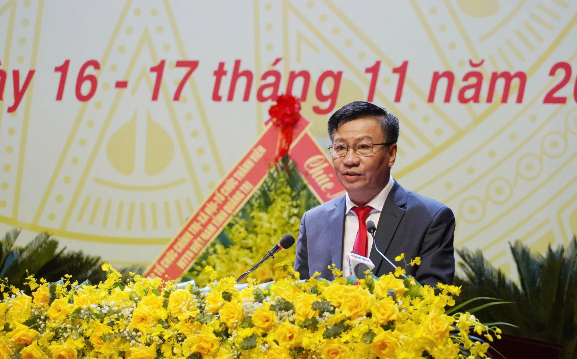 Đồng chí Nguyễn Chiến Thắng, Phó Bí thư Tỉnh ủy, Chủ tịch Ủy ban MTTQ Việt Nam tỉnh trình bày diễn văn khai mạc đại hội - Ảnh: X.P