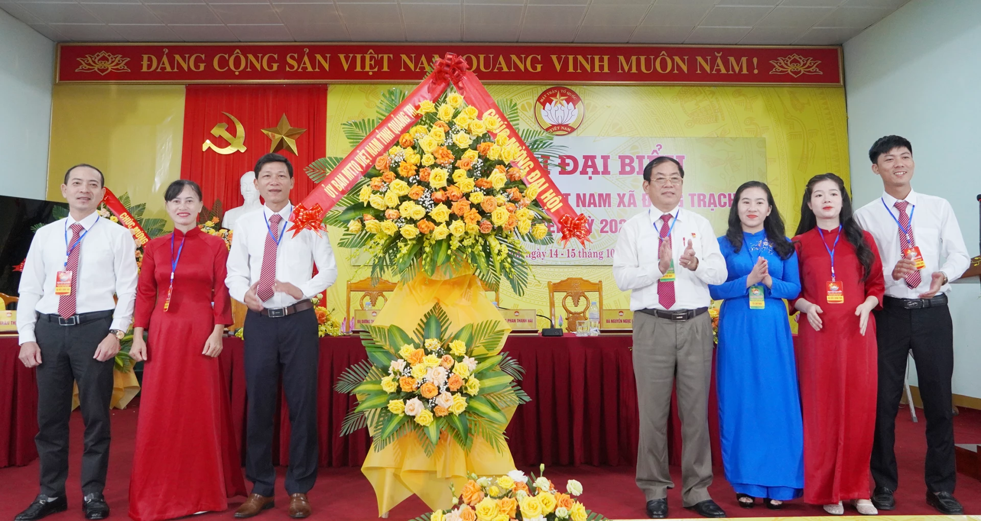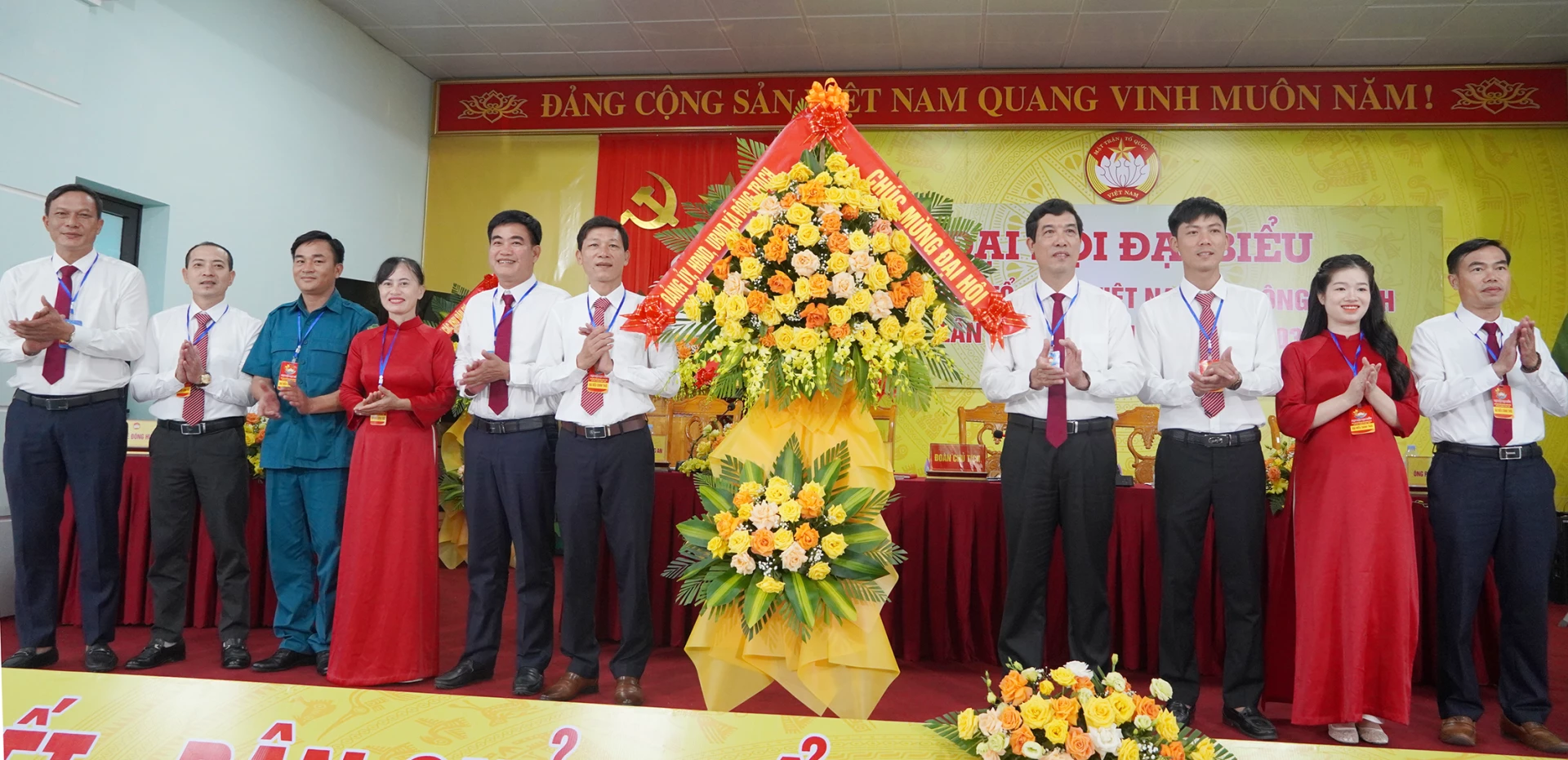 Lãnh đạo xã Đông Trạch tặng hoa chúc mừng đại hội - Ảnh: L.M