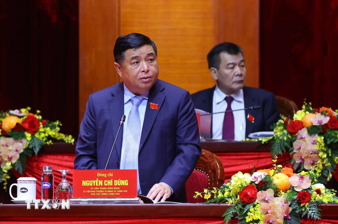 Đồng chí Nguyễn Chí Dũng, Ủy viên Trung ương Đảng, Ủy viên Ban Thường vụ Đảng ủy Chính phủ, Phó Thủ tướng Chính phủ điều hành tham luận tại Đại hội. (Ảnh: Văn Điệp/TTXVN)