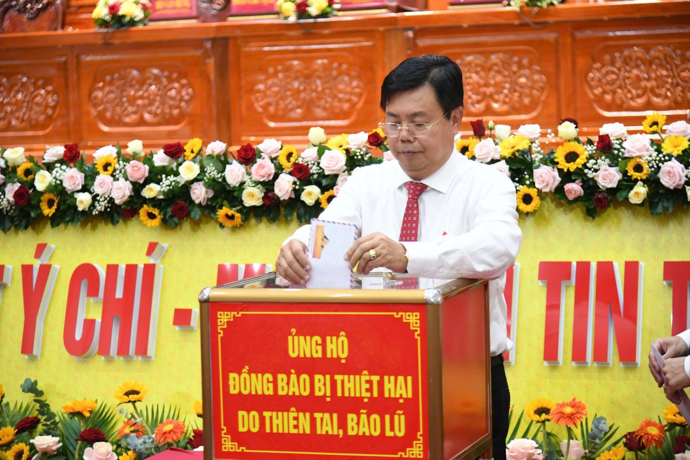 Bí thư Tỉnh ủy An Giang - Nguyễn Tiến Hải - quyên góp ủng hộ đồng bào bị thiên tai.