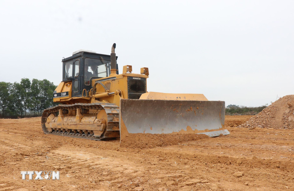 Nhà thầu thi công san lấp mặt bằng Khu công nghiệp Song Mai - Nghĩa Trung, tỉnh Bắc Ninh. (Ảnh: Thanh Thương/TTXVN)