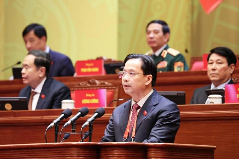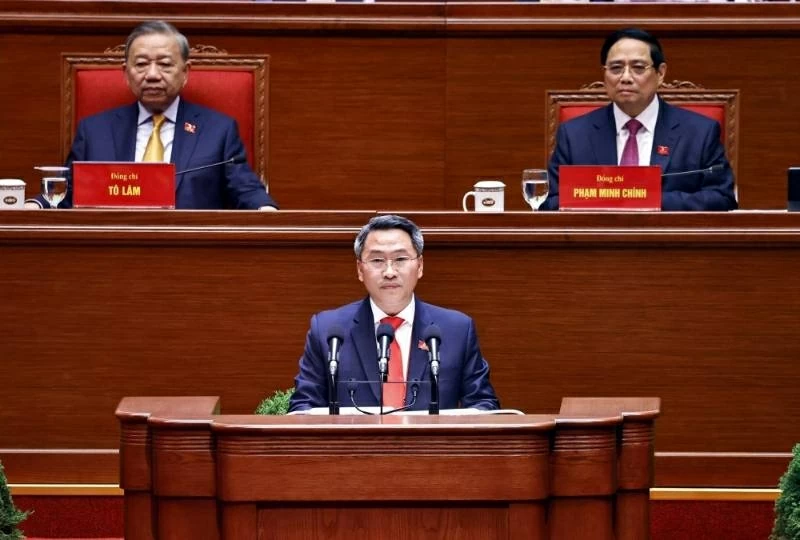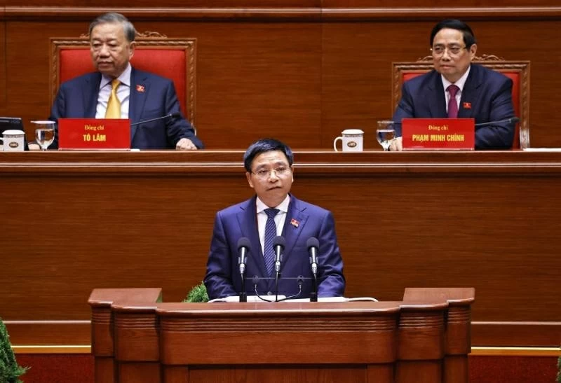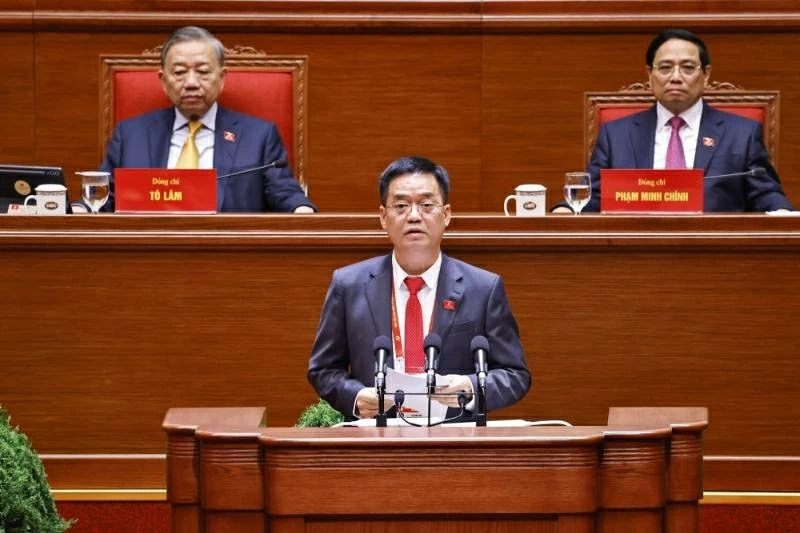 Đồng chí Lê Mạnh Hùng, Bí thư Đảng ủy, Quyền Bộ trưởng Bộ Công Thương, trình bày tham luận “Phát triển công nghiệp và thương mại Việt Nam tự chủ, kết nối, hiện đại hóa, chuyển đổi xanh, chuyển đổi số và hội nhập hiệu quả vào chuỗi sản xuất, chuỗi cung ứng toàn cầu”. (Nguồn: TTXVN)